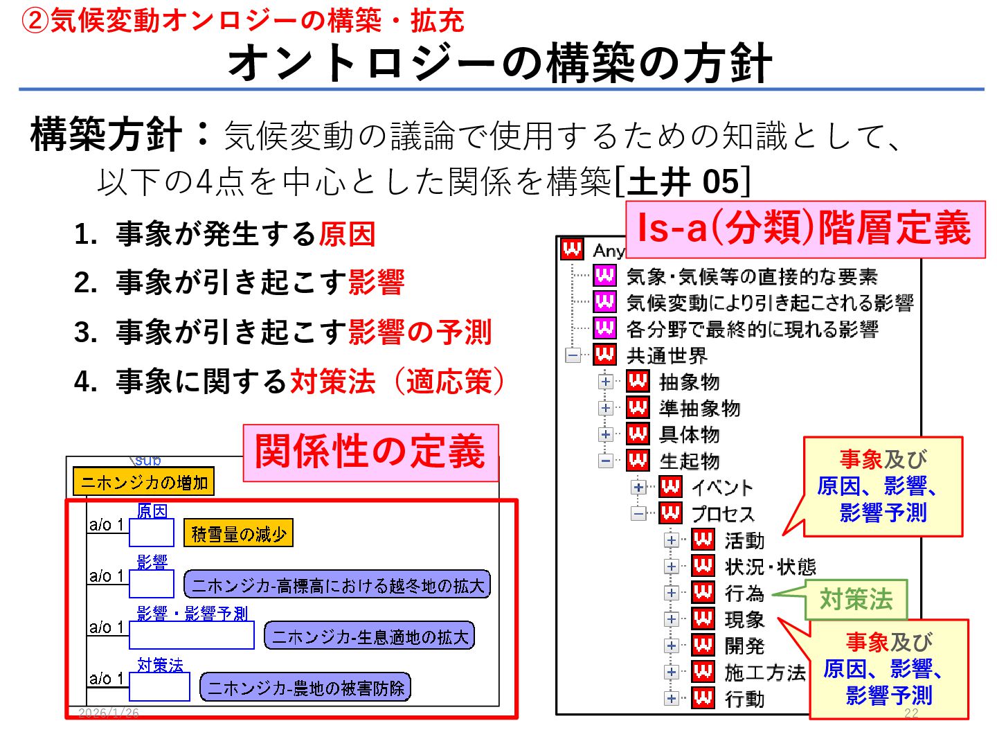 4. 事象に関する対策法(適応策) 事象及び 原因、影響、 影響予測 事象及び 原因、影響、 影響予測 対策法 関係性の定義 Is-a(分類)階層定義 ②気候変動オンロジーの構築・拡充 2026/1/26 22