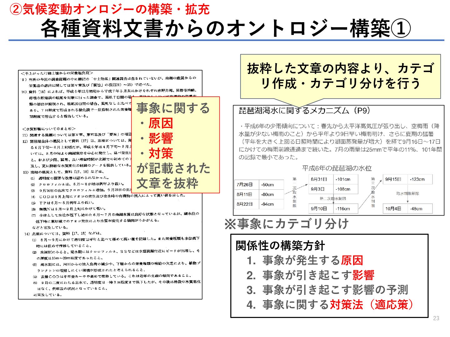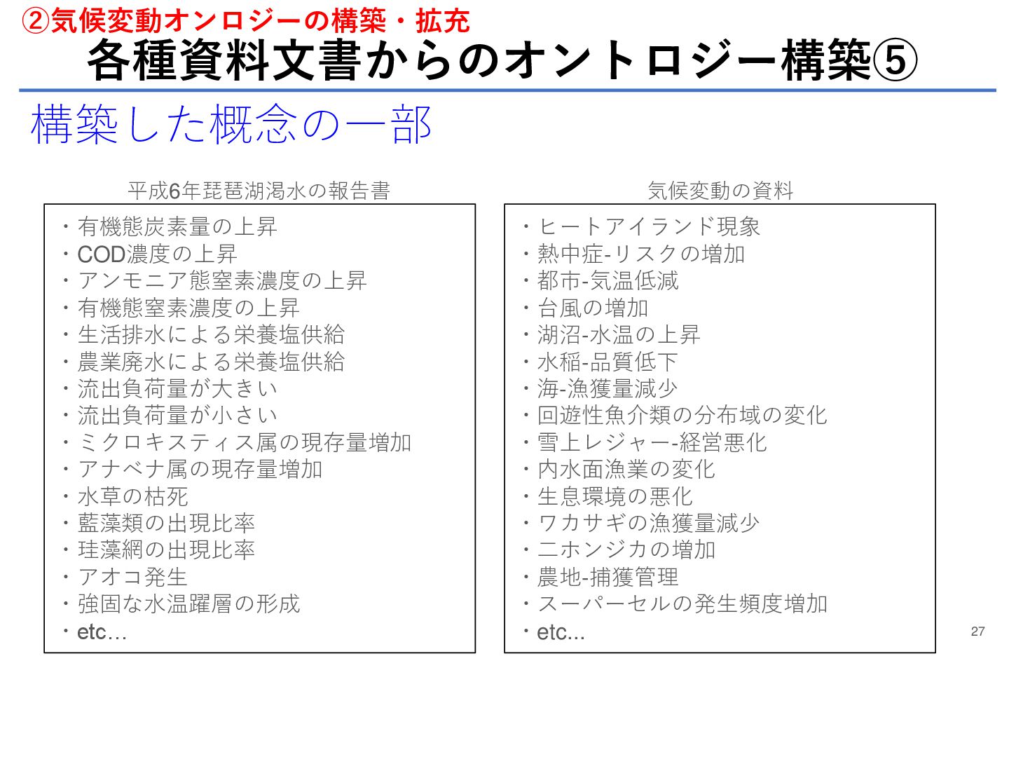 ・アナベナ属の現存量増加 ・水草の枯死 ・藍藻類の出現比率 ・珪藻網の出現比率 ・アオコ発生 ・強固な水温躍層の形成 ・etc… 構築した概念の一部 ・ヒートアイランド現象 ・熱中症-リスクの増加 ・都市-気温低減 ・台風の増加 ・湖沼-水温の上昇 ・水稲-品質低下 ・海-漁獲量減少 ・回遊性魚介類の分布域の変化 ・雪上レジャー-経営悪化 ・内水面漁業の変化 ・生息環境の悪化 ・ワカサギの漁獲量減少 ・二ホンジカの増加 ・農地-捕獲管理 ・スーパーセルの発生頻度増加 ・etc... 平成6年琵琶湖渇水の報告書 気候変動の資料 各種資料文書からのオントロジー構築⑤ ②気候変動オンロジーの構築・拡充