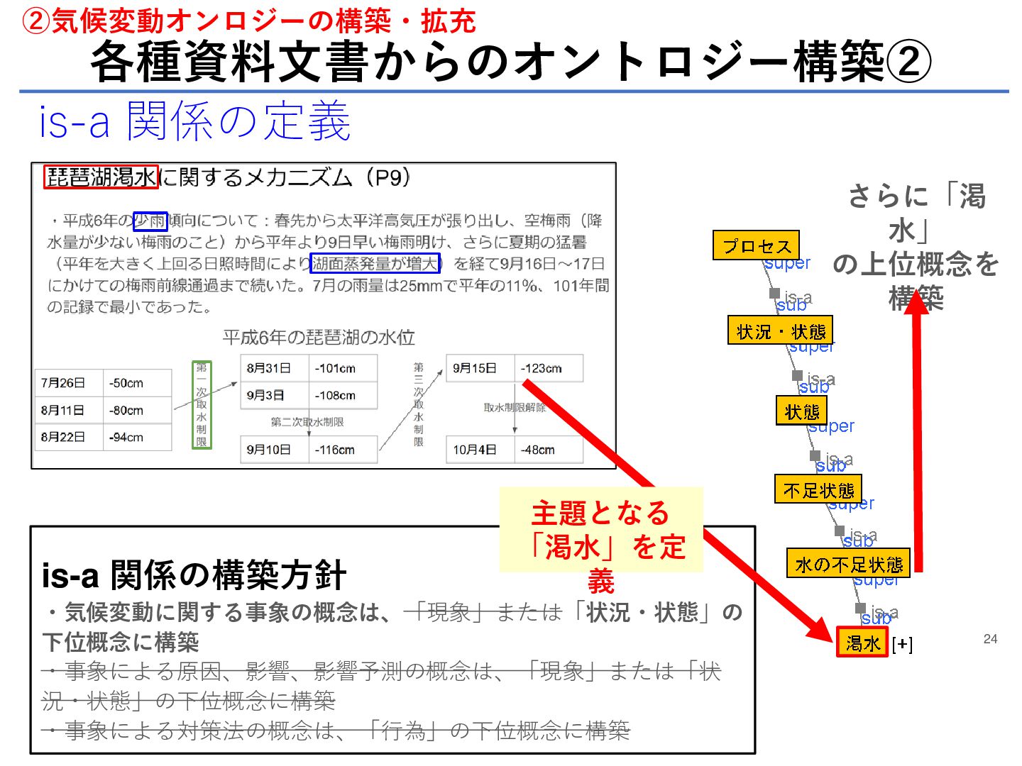 1. 事象が発生する原因 2. 事象が引き起こす影響 3. 事象が引き起こす影響の予測 4. 事象に関する対策法(適応策) 各種資料文書からのオントロジー構築① ②気候変動オンロジーの構築・拡充 23