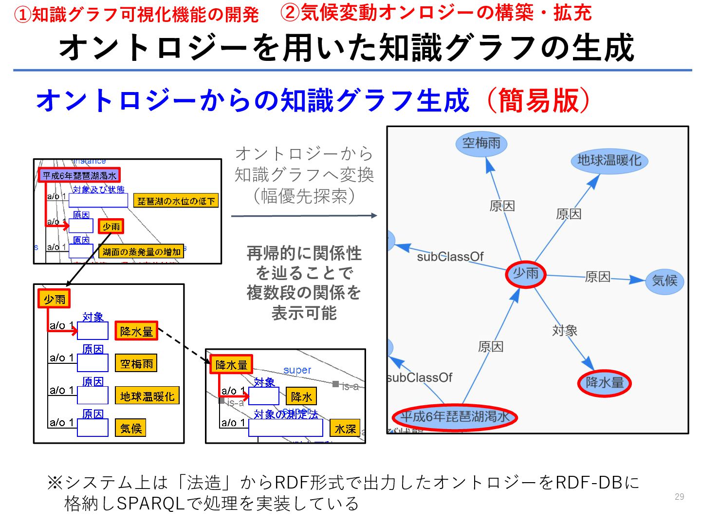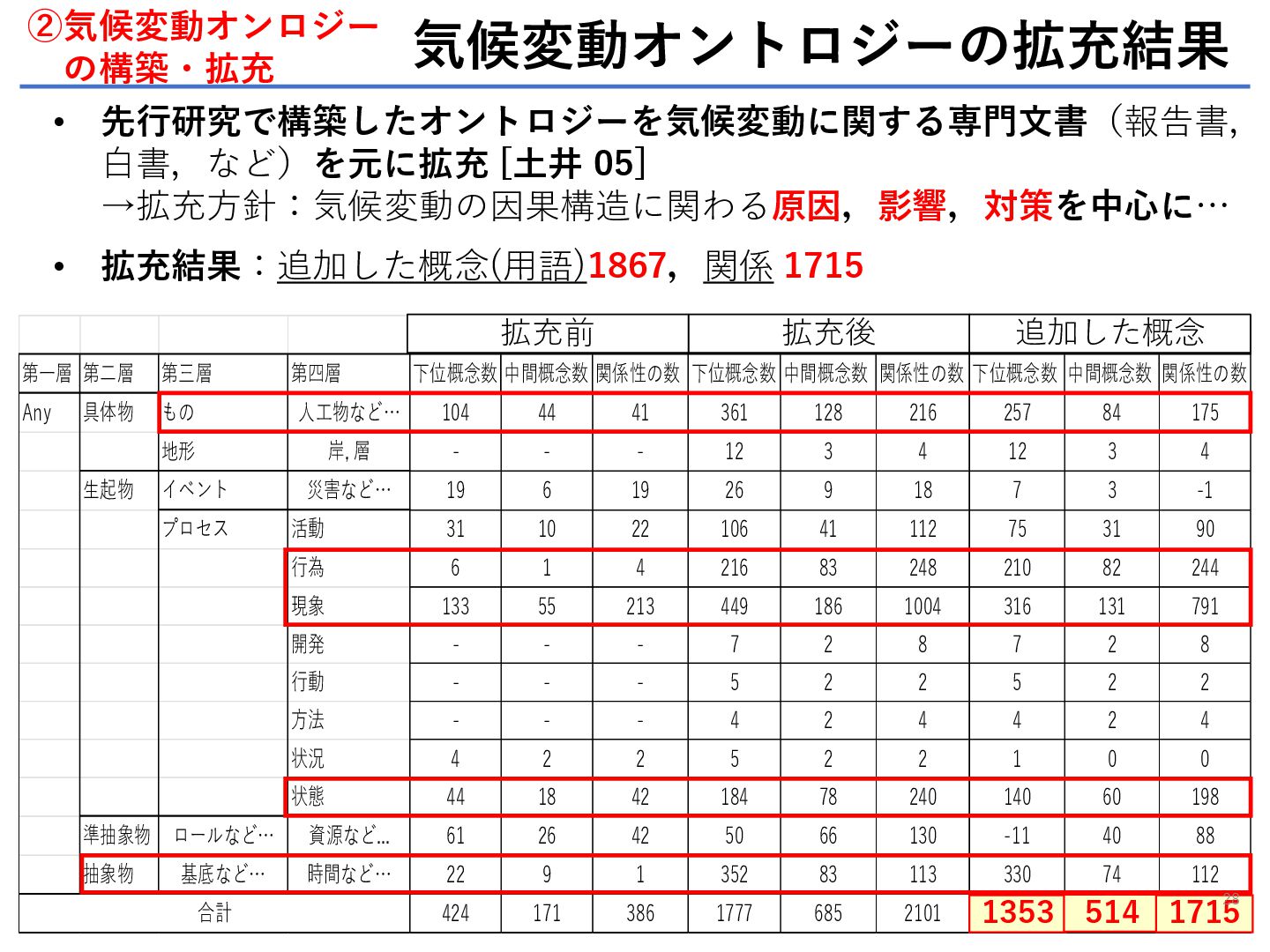 関係性の数 下位概念数 中間概念数 関係性の数 Any 具体物 もの 人工物など… 104 44 41 361 128 216 257 84 175 地形 岸, 層 - - - 12 3 4 12 3 4 生起物 イベント 災害など… 19 6 19 26 9 18 7 3 -1 プロセス 活動 31 10 22 106 41 112 75 31 90 行為 6 1 4 216 83 248 210 82 244 現象 133 55 213 449 186 1004 316 131 791 開発 - - - 7 2 8 7 2 8 行動 - - - 5 2 2 5 2 2 方法 - - - 4 2 4 4 2 4 状況 4 2 2 5 2 2 1 0 0 状態 44 18 42 184 78 240 140 60 198 準抽象物 ロールなど… 資源など... 61 26 42 50 66 130 -11 40 88 抽象物 基底など… 時間など… 22 9 1 352 83 113 330 74 112 424 171 386 1777 685 2101 1353 514 1715 統合前 統合後 統合後 - 統合前 合計 拡充前 拡充後 追加した概念 1353 514 1715 • 先行研究で構築したオントロジーを気候変動に関する専門文書(報告書, 白書,など)を元に拡充 [土井 05] →拡充方針:気候変動の因果構造に関わる原因,影響,対策を中心に… • 拡充結果:追加した概念(用語)1867,関係 1715 ②気候変動オンロジー の構築・拡充 28