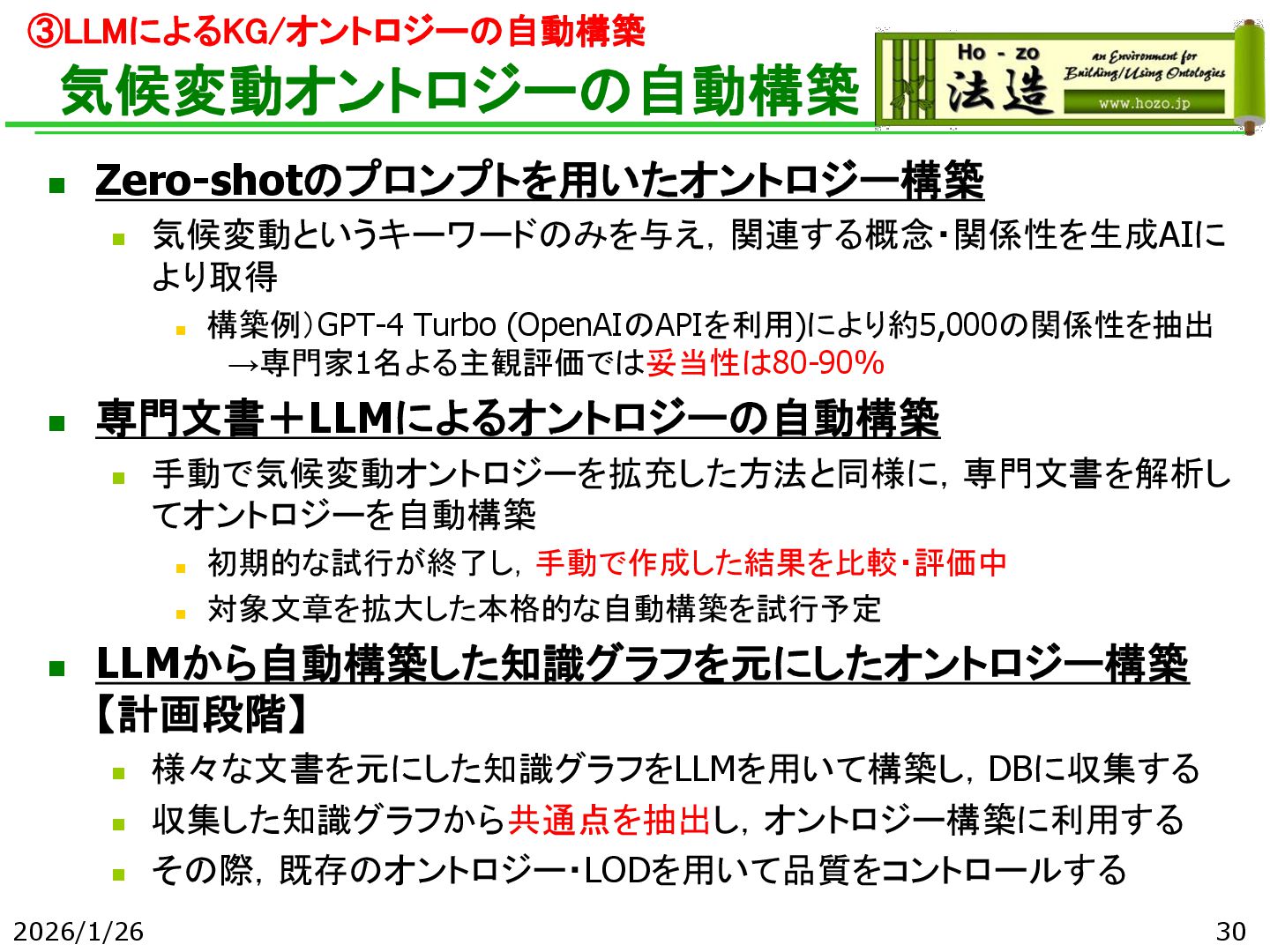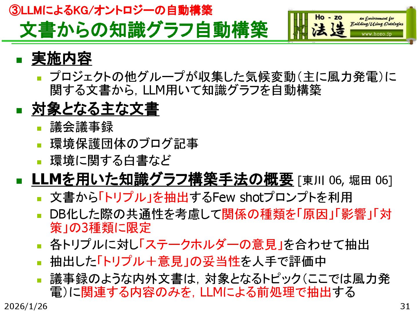 →専門家1名よる主観評価では妥当性は80-90% ◼ 専門文書+LLMによるオントロジーの自動構築 ◼ 手動で気候変動オントロジーを拡充した方法と同様に,専門文書を解析し てオントロジーを自動構築 ◼ 初期的な試行が終了し,手動で作成した結果を比較・評価中 ◼ 対象文章を拡大した本格的な自動構築を試行予定 ◼ LLMから自動構築した知識グラフを元にしたオントロジー構築 【計画段階】 ◼ 様々な文書を元にした知識グラフをLLMを用いて構築し,DBに収集する ◼ 収集した知識グラフから共通点を抽出し,オントロジー構築に利用する ◼ その際,既存のオントロジー・LODを用いて品質をコントロールする ③LLMによるKG/オントロジーの自動構築 2026/1/26 30