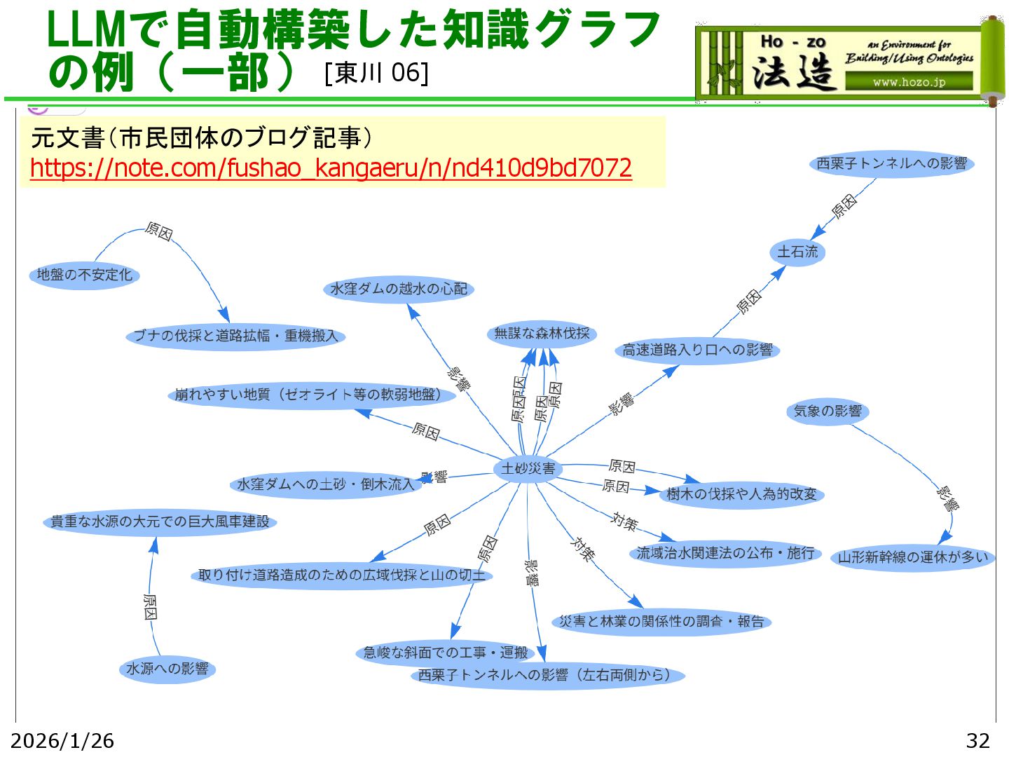 LLMで自動構築した知識グラフ の例(一部) 元文書(市民団体のブログ記事) https://note.com/fushao_kangaeru/n/nd410d9bd7072 2026/1/26 32 [東川 06]