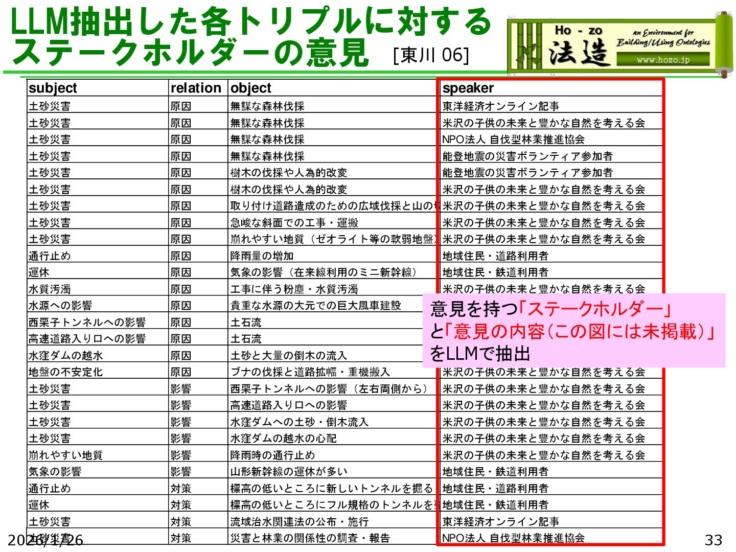 ◼ 環境保護団体のブログ記事 ◼ 環境に関する白書など ◼ LLMを用いた知識グラフ構築手法の概要 [東川 06, 堀田 06] ◼ 文書から「トリプル」を抽出するFew shotプロンプトを利用 ◼ DB化した際の共通性を考慮して関係の種類を「原因」「影響」「対 策」の3種類に限定 ◼ 各トリプルに対し「ステークホルダーの意見」を合わせて抽出 ◼ 抽出した「トリプル+意見」の妥当性を人手で評価中 ◼ 議事録のような内外文書は,対象となるトピック(ここでは風力発 電)に関連する内容のみを,LLMによる前処理で抽出する ③LLMによるKG/オントロジーの自動構築 2026/1/26 31