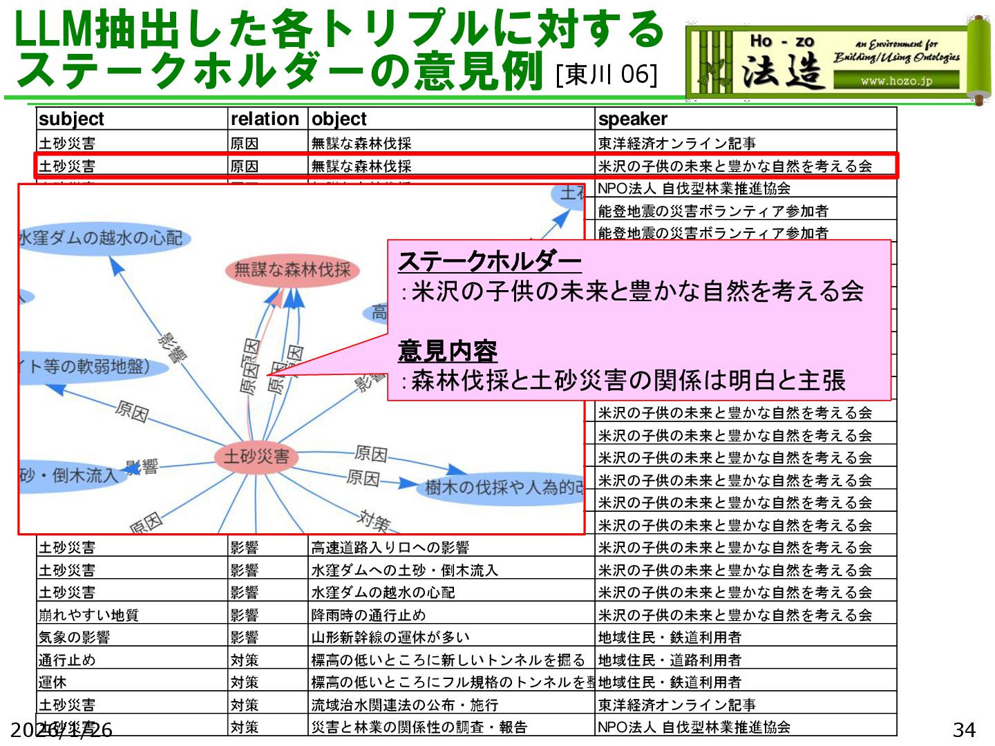 土砂災害 原因 無謀な森林伐採 米沢の子供の未来と豊かな自然を考える会 土砂災害 原因 無謀な森林伐採 NPO法人 自伐型林業推進協会 土砂災害 原因 無謀な森林伐採 能登地震の災害ボランティア参加者 土砂災害 原因 樹木の伐採や人為的改変 能登地震の災害ボランティア参加者 土砂災害 原因 樹木の伐採や人為的改変 米沢の子供の未来と豊かな自然を考える会 土砂災害 原因 取り付け道路造成のための広域伐採と山の切土 米沢の子供の未来と豊かな自然を考える会 土砂災害 原因 急峻な斜面での工事・運搬 米沢の子供の未来と豊かな自然を考える会 土砂災害 原因 崩れやすい地質(ゼオライト等の軟弱地盤)米沢の子供の未来と豊かな自然を考える会 通行止め 原因 降雨量の増加 地域住民・道路利用者 運休 原因 気象の影響(在来線利用のミニ新幹線) 地域住民・鉄道利用者 水質汚濁 原因 工事に伴う粉塵・水質汚濁 米沢の子供の未来と豊かな自然を考える会 水源への影響 原因 貴重な水源の大元での巨大風車建設 米沢の子供の未来と豊かな自然を考える会 西栗子トンネルへの影響 原因 土石流 米沢の子供の未来と豊かな自然を考える会 高速道路入り口への影響 原因 土石流 米沢の子供の未来と豊かな自然を考える会 水窪ダムの越水 原因 土砂と大量の倒木の流入 米沢の子供の未来と豊かな自然を考える会 地盤の不安定化 原因 ブナの伐採と道路拡幅・重機搬入 米沢の子供の未来と豊かな自然を考える会 土砂災害 影響 西栗子トンネルへの影響(左右両側から) 米沢の子供の未来と豊かな自然を考える会 土砂災害 影響 高速道路入り口への影響 米沢の子供の未来と豊かな自然を考える会 土砂災害 影響 水窪ダムへの土砂・倒木流入 米沢の子供の未来と豊かな自然を考える会 土砂災害 影響 水窪ダムの越水の心配 米沢の子供の未来と豊かな自然を考える会 崩れやすい地質 影響 降雨時の通行止め 米沢の子供の未来と豊かな自然を考える会 気象の影響 影響 山形新幹線の運休が多い 地域住民・鉄道利用者 通行止め 対策 標高の低いところに新しいトンネルを掘る 地域住民・道路利用者 運休 対策 標高の低いところにフル規格のトンネルを整備 地域住民・鉄道利用者 土砂災害 対策 流域治水関連法の公布・施行 東洋経済オンライン記事 土砂災害 対策 災害と林業の関係性の調査・報告 NPO法人 自伐型林業推進協会 意見を持つ「ステークホルダー」 と「意見の内容(この図には未掲載)」 をLLMで抽出 2026/1/26 33 [東川 06]