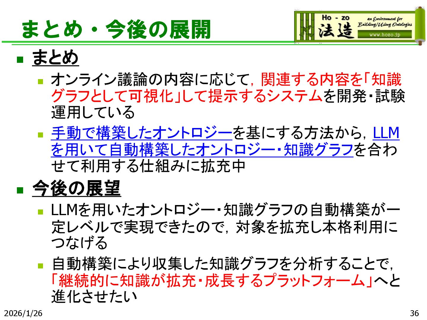 せて利用する仕組みに拡充中 ◼ 今後の展望 ◼ LLMを用いたオントロジー・知識グラフの自動構築が一 定レベルで実現できたので,対象を拡充し本格利用に つなげる ◼ 自動構築により収集した知識グラフを分析することで, 「継続的に知識が拡充・成長するプラットフォーム」へと 進化させたい 2026/1/26 36