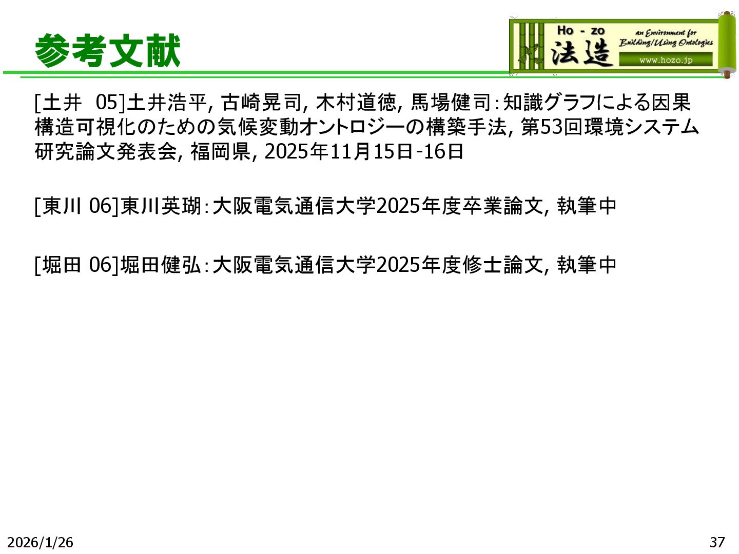 参考文献 [土井 05]土井浩平, 古崎晃司, 木村道徳, 馬場健司:知識グラフによる因果 構造可視化のための気候変動オントロジーの構築手法, 第53回環境システム 研究論文発表会, 福岡県,