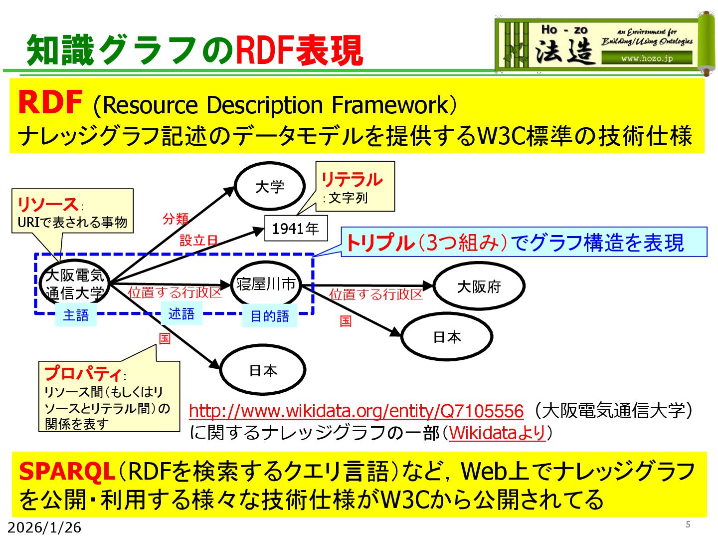 ◼ Linked Data(2007-) ◼ Web標準技術(RDF)に基づいて公開された知識グラフ ◼ Webの仕組みを用いてデータを“リンク”することにより,「データの新た な価値の創出」をめざした技術 ◼ オープンデータ(誰でも自由に利用可能なデータ)をLinked Dataとして 公開したもの=Linked Open Data(LOD) ◼ プロパティグラフ ◼ ノード・エッジからなるグラフ構造に「キー・値」形式の属性(プロパティ) を持たせたグラフ表現 ◼ Neo4j などのグラフDBで実装されている (単なる)グラフデータとの違い 2026/1/26 4