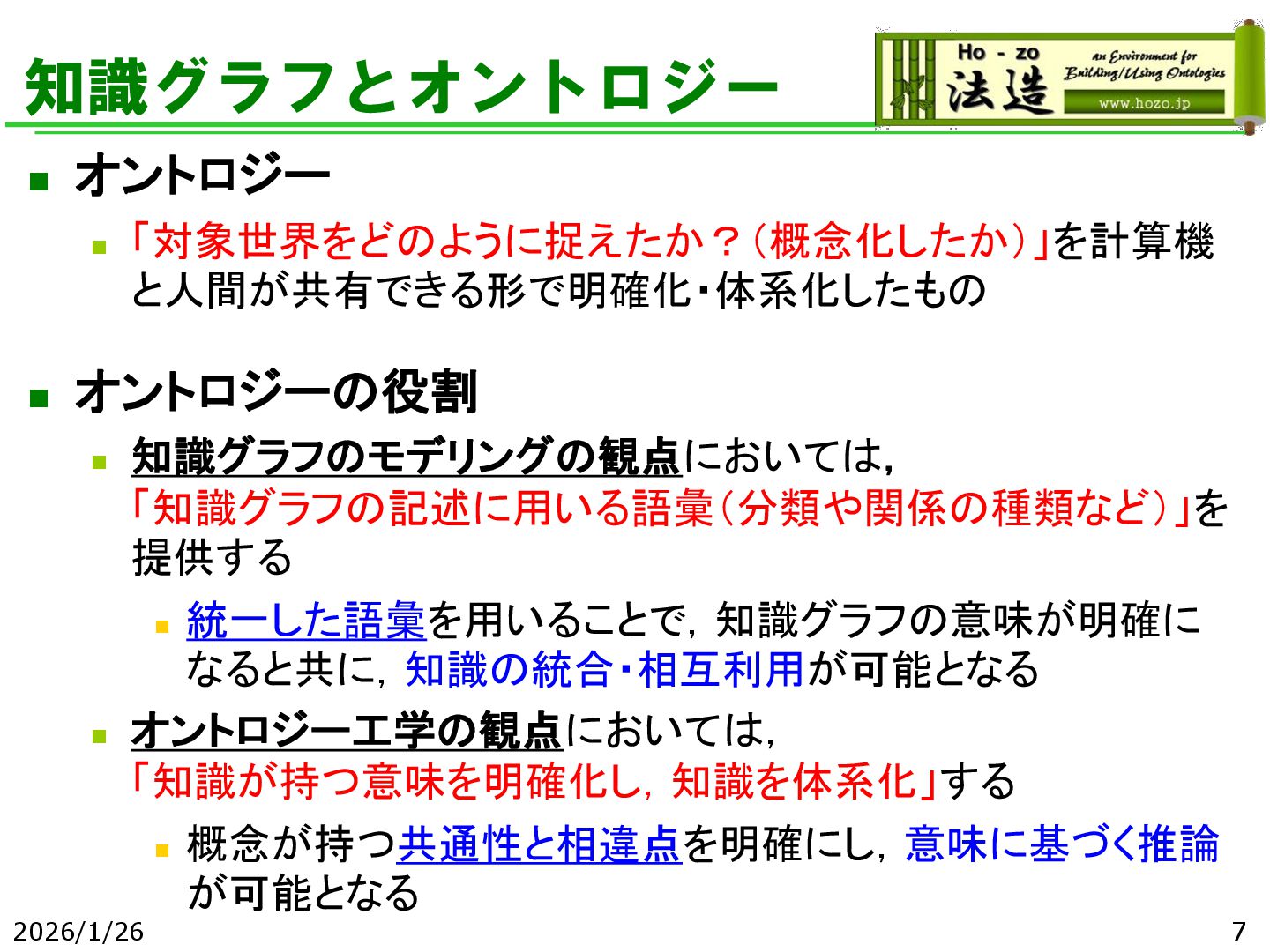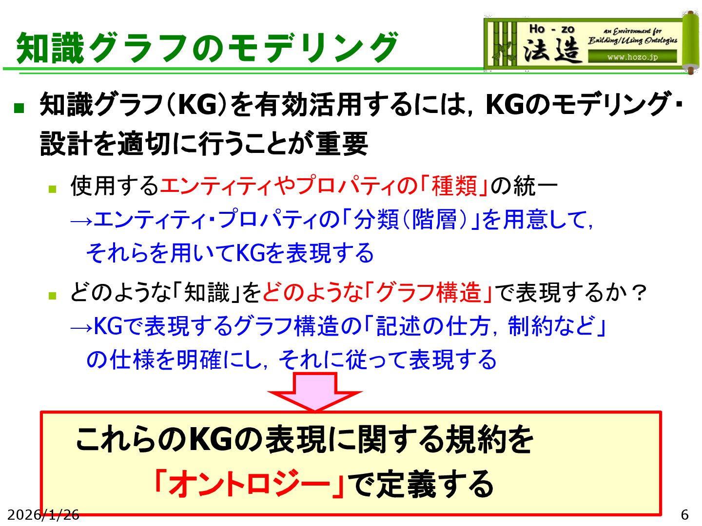 →KGで表現するグラフ構造の「記述の仕方,制約など」 の仕様を明確にし,それに従って表現する これらのKGの表現に関する規約を 「オントロジー」で定義する 2026/1/26 6