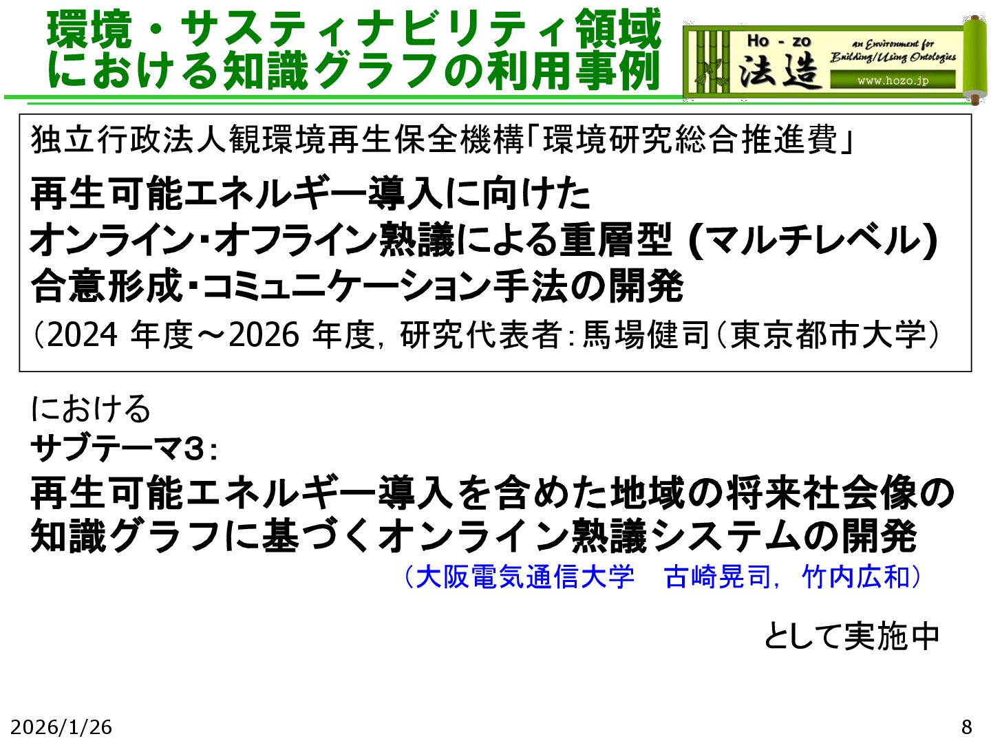 における サブテーマ3: 再生可能エネルギー導入を含めた地域の将来社会像の 知識グラフに基づくオンライン熟議システムの開発 (大阪電気通信大学 古崎晃司,竹内広和) として実施中 2026/1/26 8