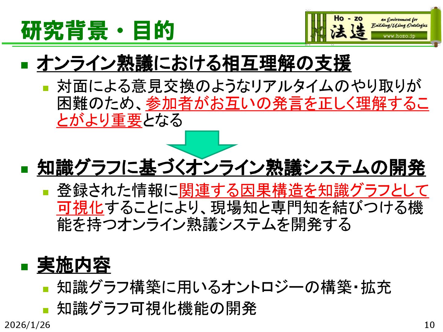 登録された情報に関連する因果構造を知識グラフとして 可視化することにより、現場知と専門知を結びつける機 能を持つオンライン熟議システムを開発する ◼ 実施内容 ◼ 知識グラフ構築に用いるオントロジーの構築・拡充 ◼ 知識グラフ可視化機能の開発 2026/1/26 10
