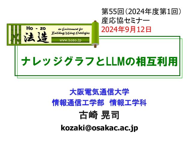 of Large Language Models, Gerhard Weikum https://videolectures.net/iswc2023_weikum_knowledge_graphs/  Semantic Web Research in the Age of Generative Artificial Intelligence, Deborah McGuinness https://videolectures.net/iswc2023_mc_guinness_web_research/ https://www.slideshare.net/deborahmcguinness/iswc2023mcguinnesstwc16x9finalshortpdf  [Yiming 03] Yiming Tan, Dehai Min, Yu Li, Wenbo Li, Nan Hu, Yongrui Chen and Guilin Qi, Can ChatGPT Replace Traditional KBQA Models? An In-depth Analysis of GPT family LLMs' Question Answering Performance, Proc. ISWC2023, Part I, pp. 348-367, Athens, Greece, Nov. 2023.  [大山 04] 大山 陽和太, 知識グラフと大規模言語モデルのファクト情報に関する質問応答能力の比較, 大阪電気通信 大学情報通信工学部・情報工学科学・卒業論文,2024.  [脇所 04] 脇所 昂輝, Wikidataを用いた一問一答問題に対する解答生成パターンの分析と評価, 大阪電気通信大学 情報通信工学部・情報工学科学・卒業論文,2024.  [Nandana 03] Nandana Mihindukulasooriya, Sanju Tiwari, Carlos Enguix and Kusum Lata, Text2KGBench: A Benchmark for Ontology-Driven Knowledge Graph Generation from Text, Proc. ISWC2023, Part II, pp. 247-265, Athens, Greece, Nov. 2023.  [Hamed 03] Hamed Babaei Giglou, Jennifer D'Souza and Soren Auer, LLMs4OL: Large Language Models? for Ontology Learning, Proc. ISWC2023, Part I, pp. 408-427, Athens, Greece, Nov. 2023.  [堀田 04] 堀田将吾,ナレッジグラフ推論チャレンジ2023「推理小説部門」応募作品, https://challenge.knowledge- graph.jp/results/results2023.html, 2024.  [鈴木 04] 鈴木陽太,ナレッジグラフ推論チャレンジ2023「一般部門」応募作品, https://challenge.knowledge- graph.jp/results/results2023.html, 2024.  ISWCサーベイ会 https://www.sigswo.org/ISWC-Survey  JSAI2024企画セッション-生成AI時代のナレッジグラフ https://challenge.knowledge-graph.jp/jsai2024/