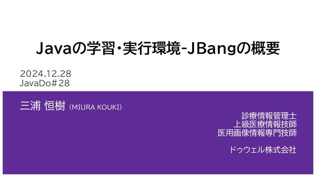 Name.java void main() { System.out.println("Hello JBang!"); Name name = new Name(); System.out.println("Hello " + name.getName()); } Hello.java $ jbang --enable-preview Hello.java [jbang] Building jar for Hello.java… Note: /mnt/c/Files/java/quarkus/Hello.java uses preview features of Java SE 21. Note: Recompile with -Xlint:preview for details. Hello JBang! Hello Kouki Miura JBangとは https://github.com/jbangdev/jbang