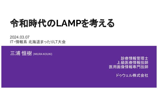 令和時代のLAMPを考える 三浦 恒樹 (MIURA KOUKI) 診療情報管理士 上級医療情報技師 医用画像情報専門技師 ドゥウェル株式会社 2024.03.07