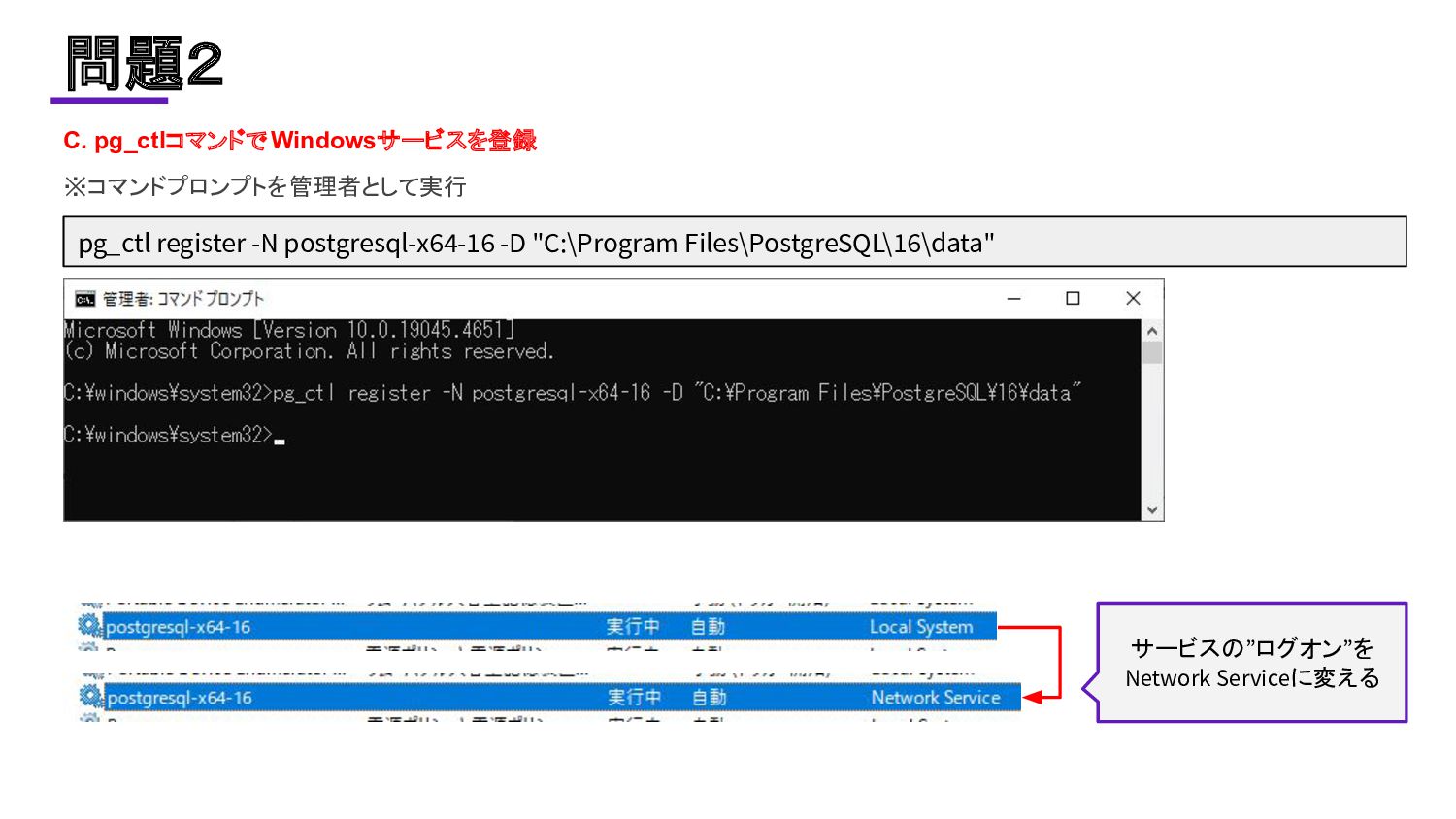 問題2 C. pg_ctlコマンドで Windowsサービスを登録 ※コマンドプロンプトを管理者として実行 pg_ctl register -N postgresql-x64-16 -D