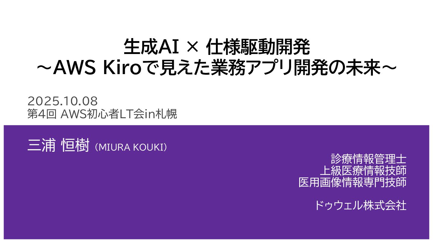 生成AI × 仕様駆動開発 ~AWS Kiroで見えた業務アプリ開発の未来~ 2025.10.08 第4回 AWS初心者LT会in札幌 三浦 恒樹