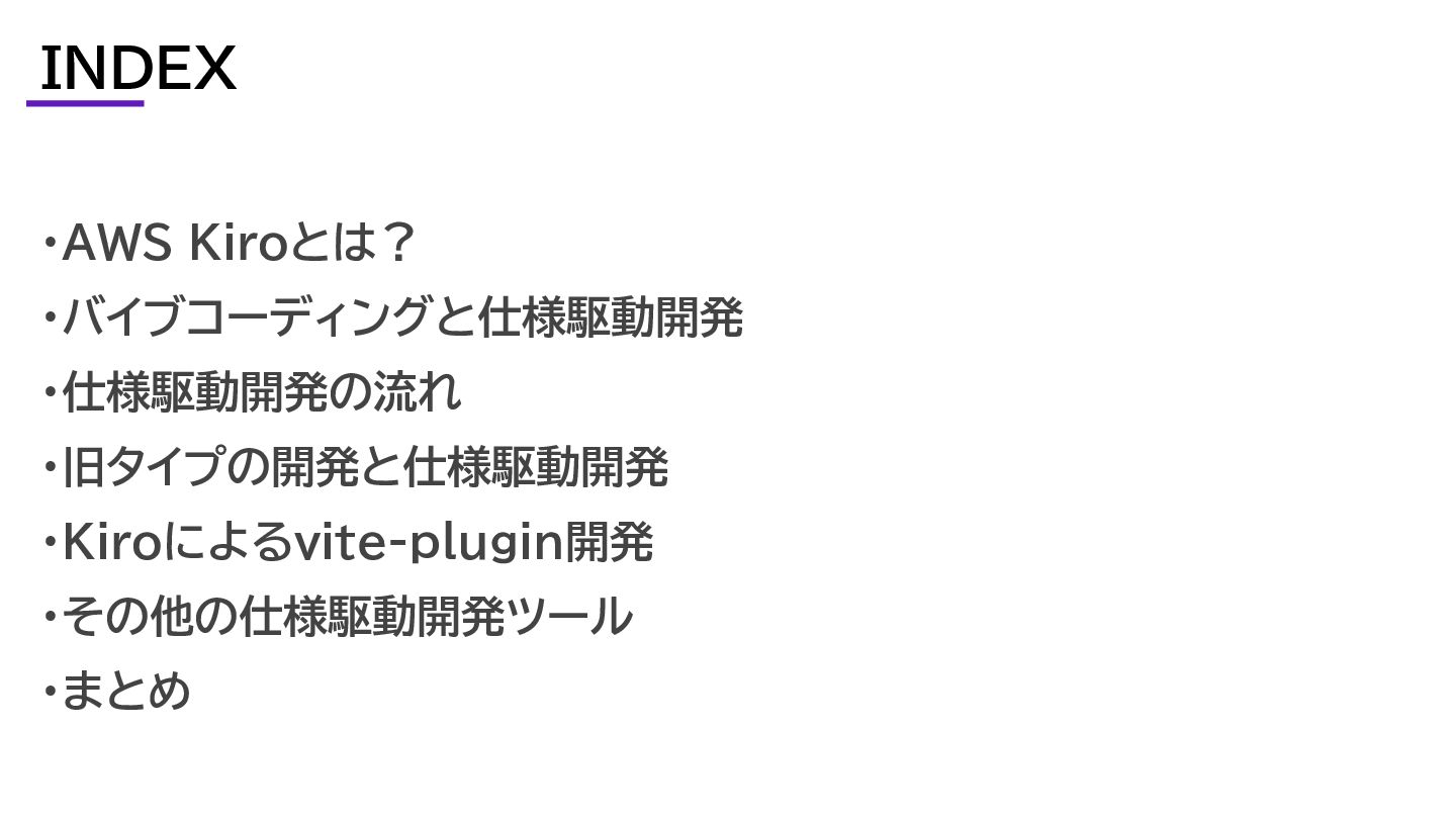 ・AWS Kiroとは? ・バイブコーディングと仕様駆動開発 ・仕様駆動開発の流れ ・旧タイプの開発と仕様駆動開発 ・Kiroによるvite-plugin開発 ・その他の仕様駆動開発ツール ・まとめ INDEX