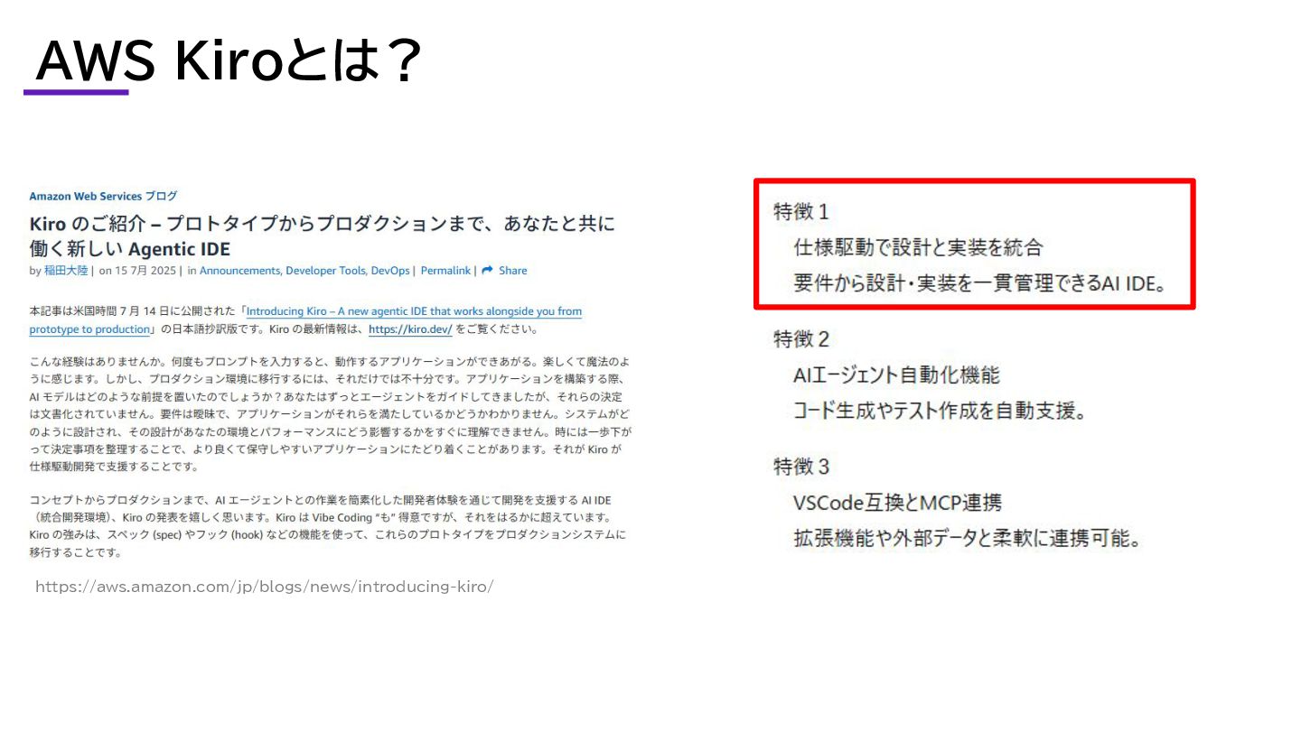 AWS Kiroとは? https://aws.amazon.com/jp/blogs/news/introducing-kiro/