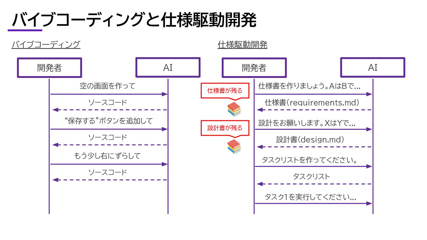バイブコーディングと仕様駆動開発 バイブコーディング 仕様駆動開発 開発者 AI 空の画面を作って ソースコード “保存する”ボタンを追加して ソースコード もう少し右にずらして