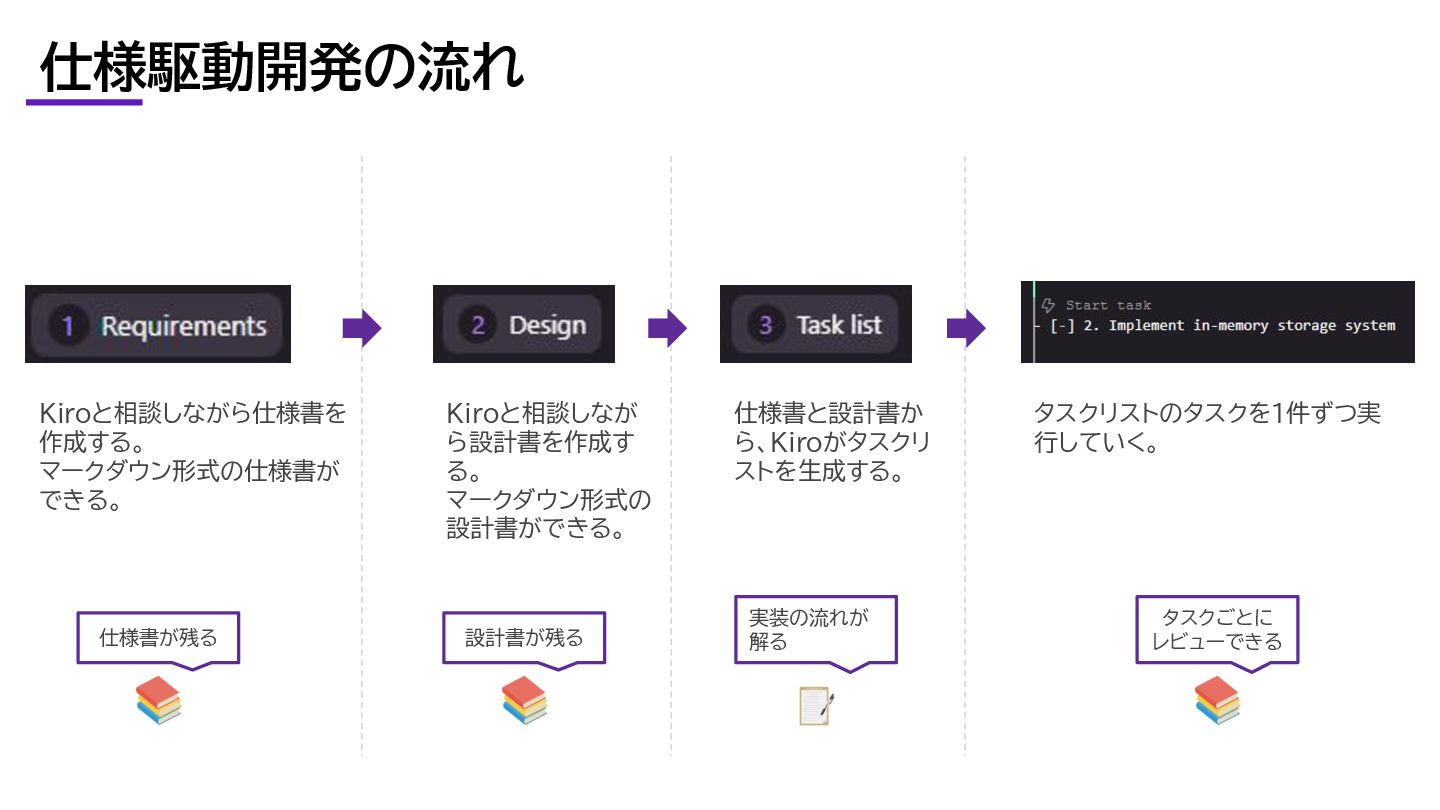 仕様書と設計書か ら、Kiroがタスクリ ストを生成する。 タスクリストのタスクを1件ずつ実 行していく。 仕様書が残る 設計書が残る 実装の流れが 解る タスクごとに レビューできる