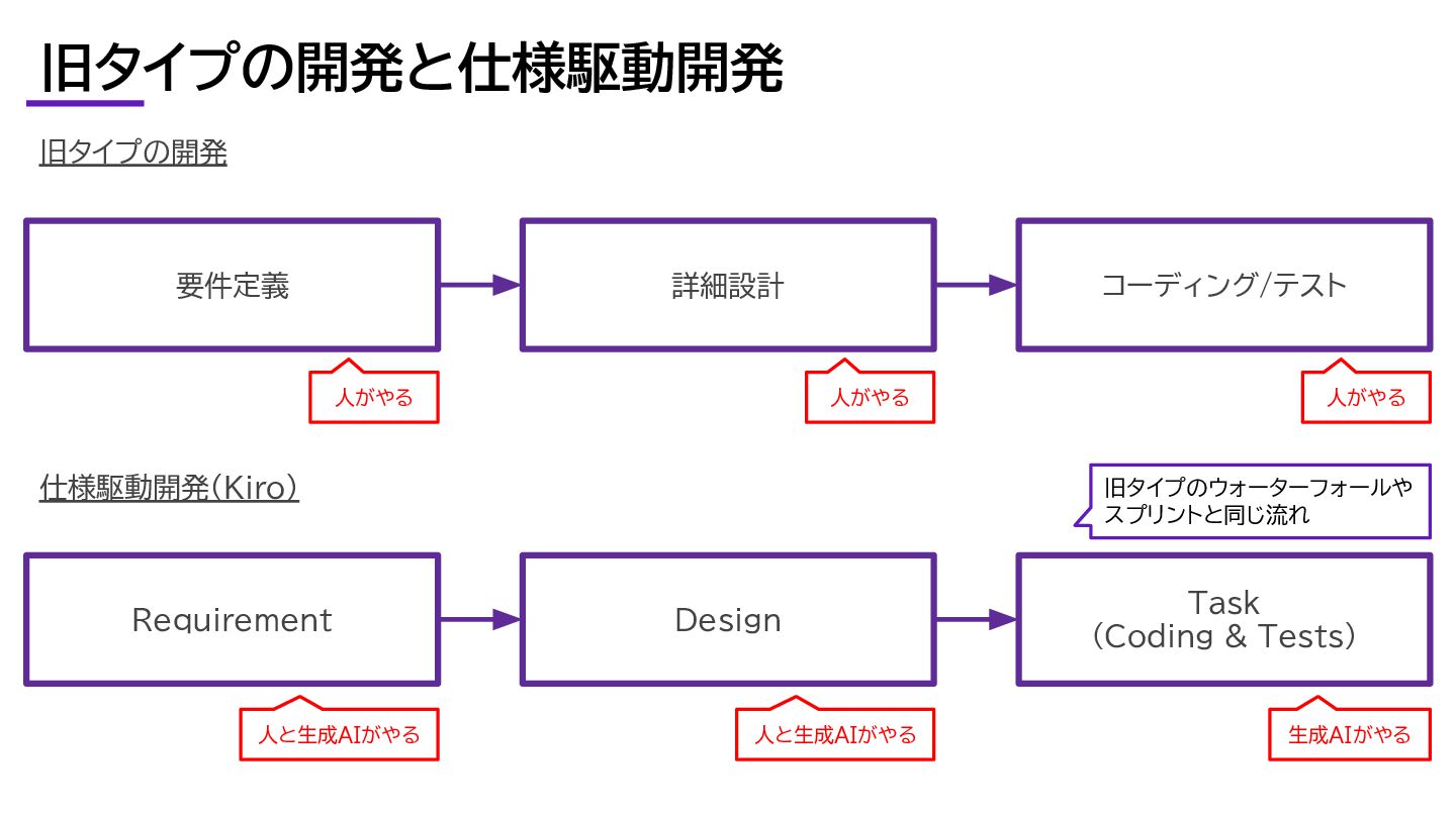 旧タイプの開発と仕様駆動開発 要件定義 旧タイプの開発 仕様駆動開発(Kiro) 詳細設計 コーディング/テスト Requirement Design Task (Coding