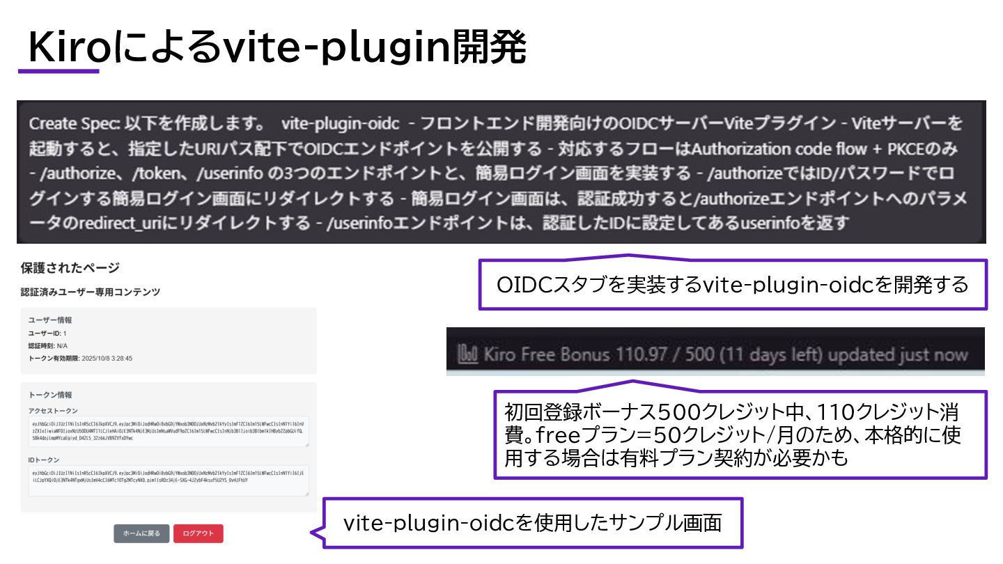 Kiroによるvite-plugin開発 OIDCスタブを実装するvite-plugin-oidcを開発する vite-plugin-oidcを使用したサンプル画面 初回登録ボーナス500クレジット中、110クレジット消 費。freeプラン=50クレジット/月のため、本格的に使 用する場合は有料プラン契約が必要かも