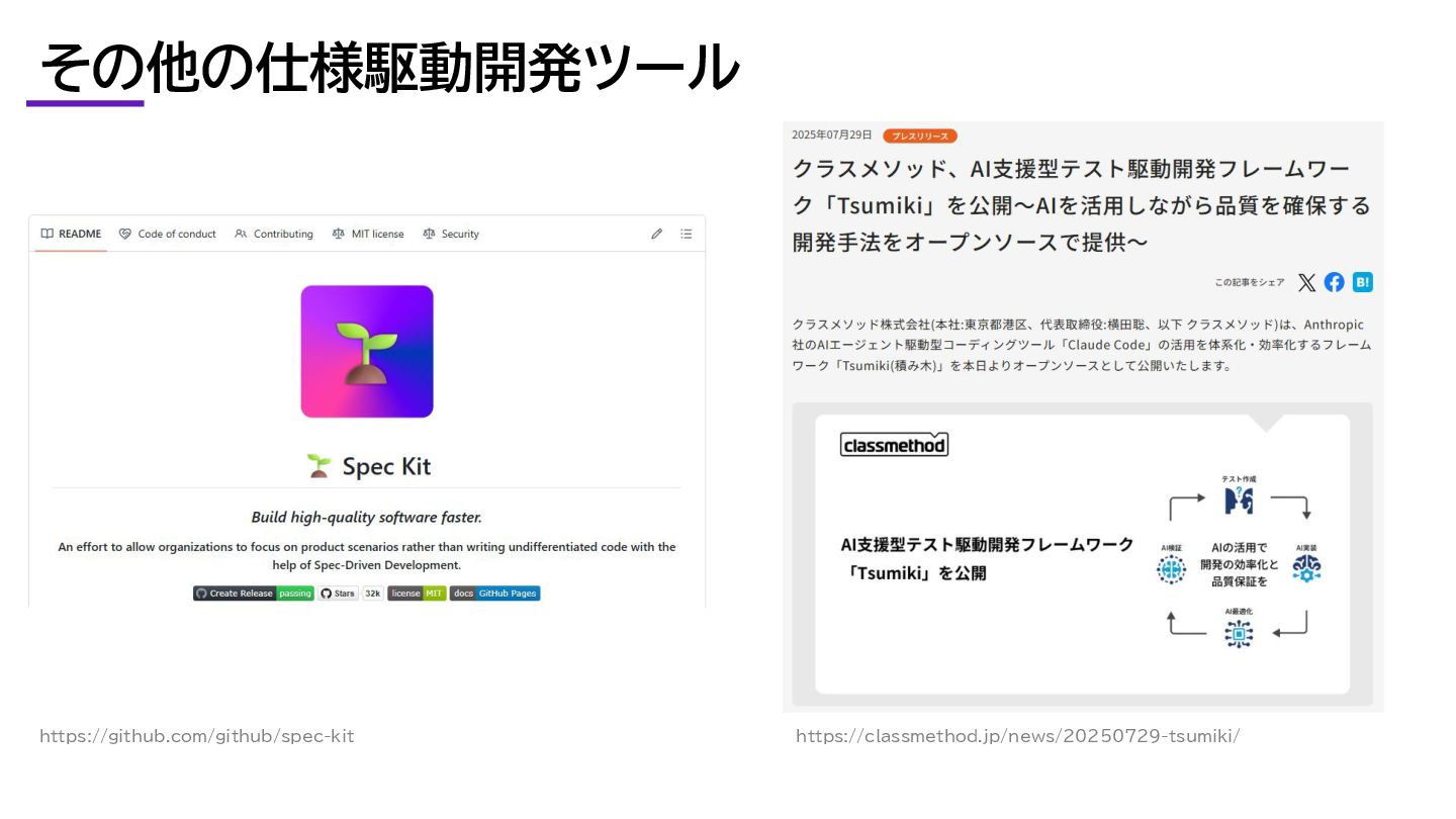 その他の仕様駆動開発ツール https://github.com/github/spec-kit https://classmethod.jp/news/20250729-tsumiki/