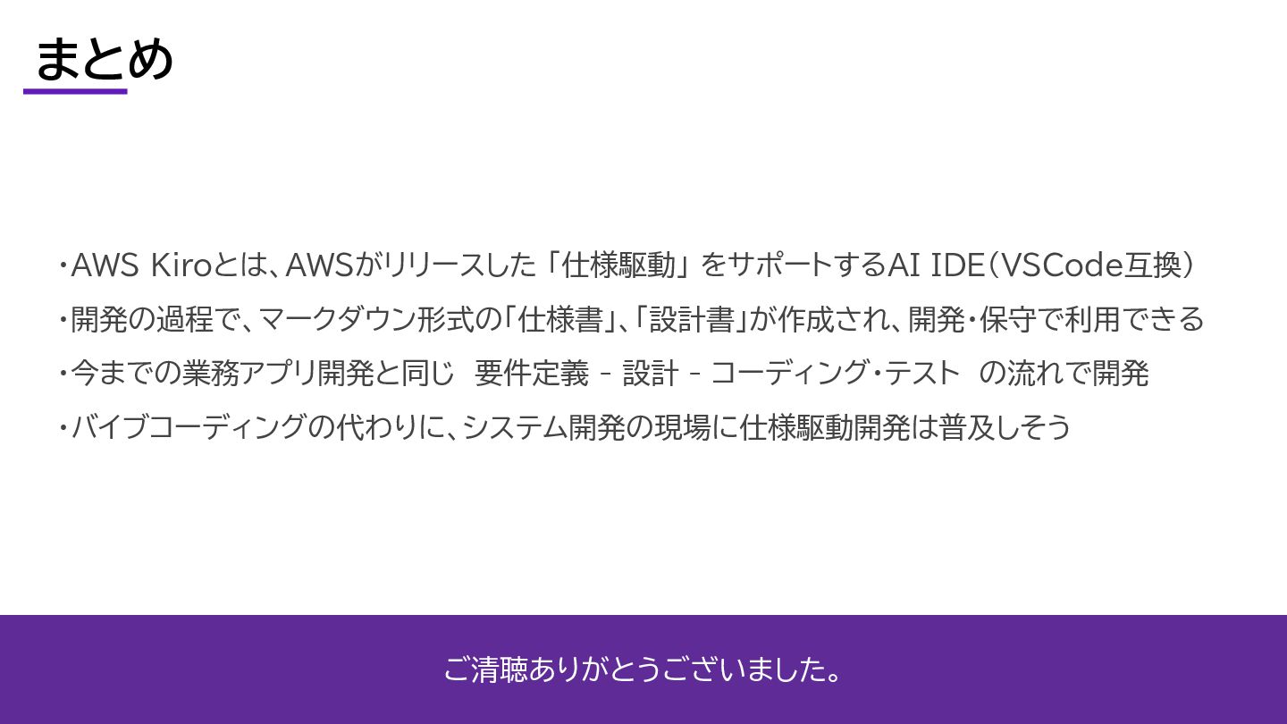コーディング・テスト の流れで開発 ・バイブコーディングの代わりに、システム開発の現場に仕様駆動開発は普及しそう ご清聴ありがとうございました。 まとめ