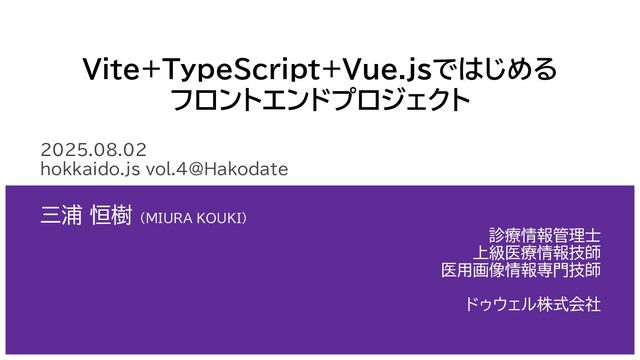 Vite+TypeScript+Vue.jsではじめる フロントエンドプロジェクト 2025.08.02 hokkaido.js vol.4@Hakodate 三浦 恒樹 (MIURA KOUKI) 診療情報管理士