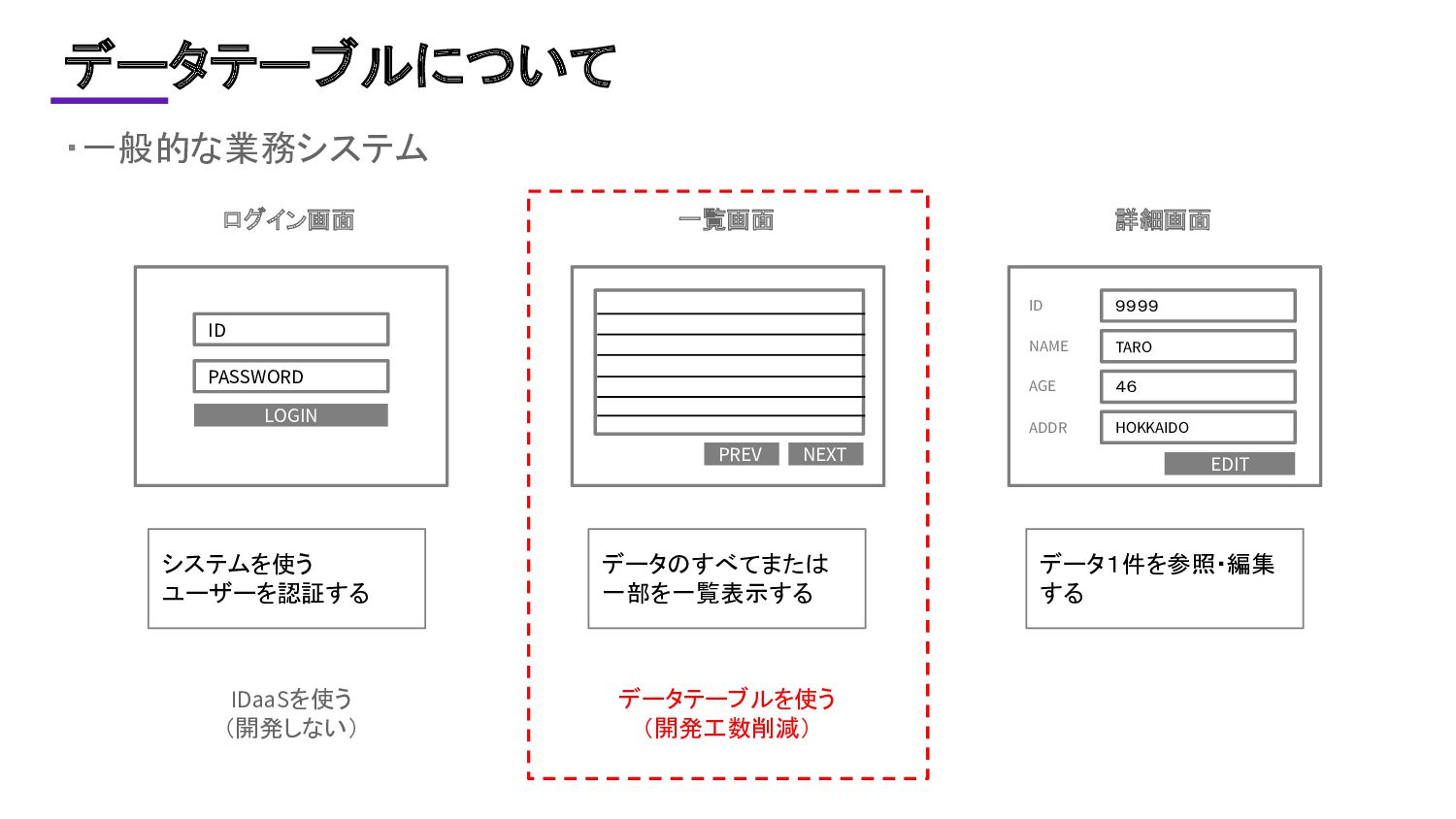 データテーブルについて ・一般的な業務システム ログイン画面 一覧画面 詳細画面 ID PASSWORD LOGIN 9999 TARO