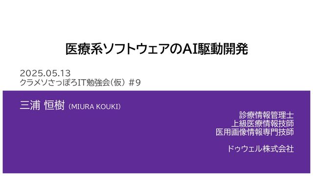 医療系ソフトウェアのAI駆動開発 2025.05.13 クラメソさっぽろIT勉強会(仮) #9 三浦 恒樹 (MIURA KOUKI) 診療情報管理士 上級医療情報技師