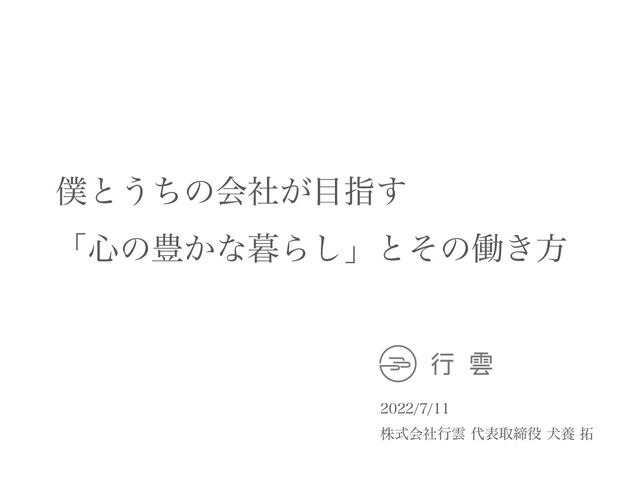株式会社行雲が目指す「心の豊かな暮らし」とその働き方についてのまとめスライドです。 2022年7月11日にノートルダム清心女子大学さんで行った講義に使用したスライドを再編集したものです。