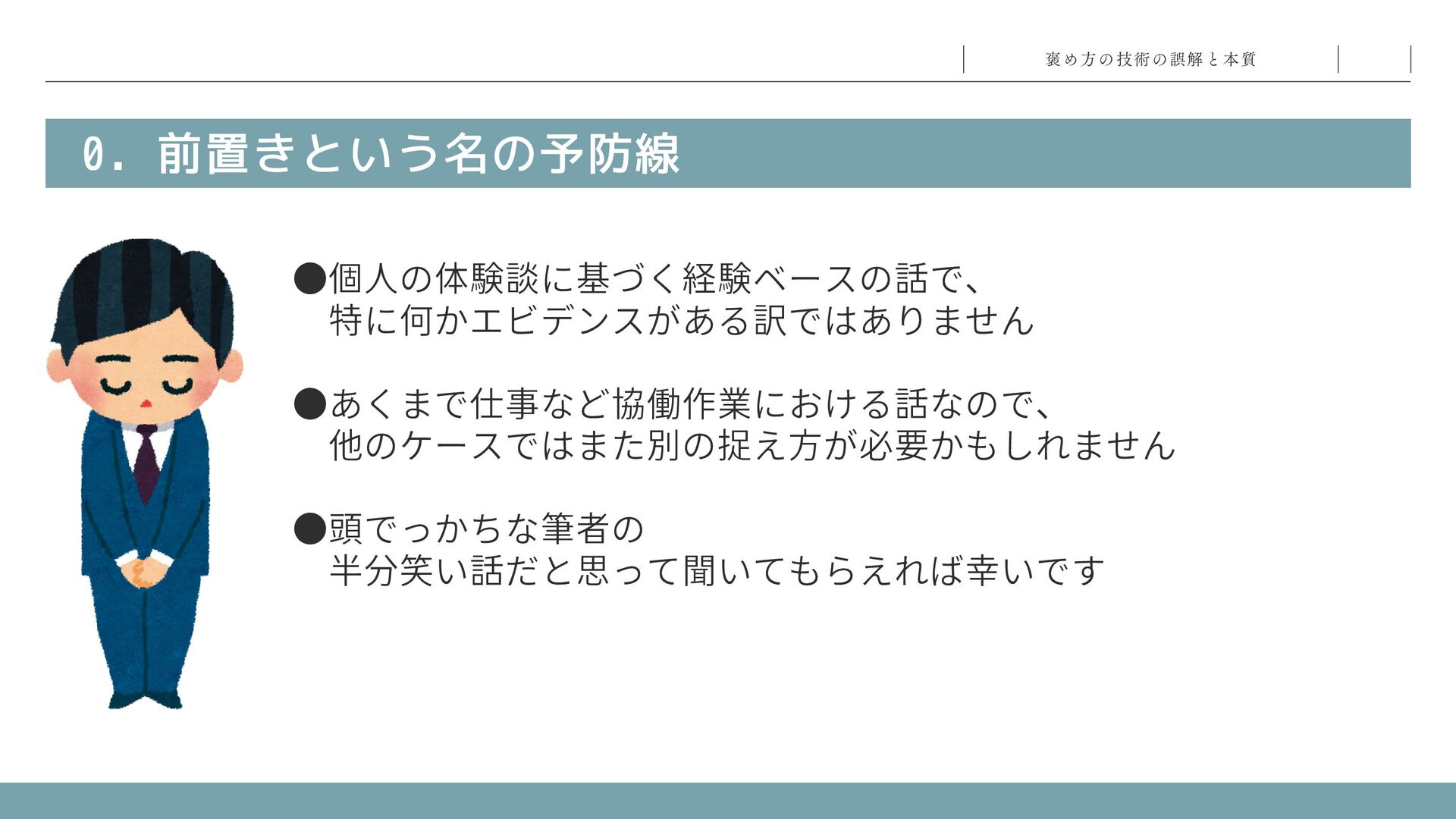 褒め方の技術の誤解と本質 •個人の体験談に基づく経験ベースの話で、 特に何かエビデンスがある訳ではありません •あくまで仕事など協働作業における話なので、 他のケースではまた別の捉え方が必要かもしれません •頭でっかちな筆者の 半分笑い話だと思って聞いてもらえれば幸いです 0. 前置きという名の予防線