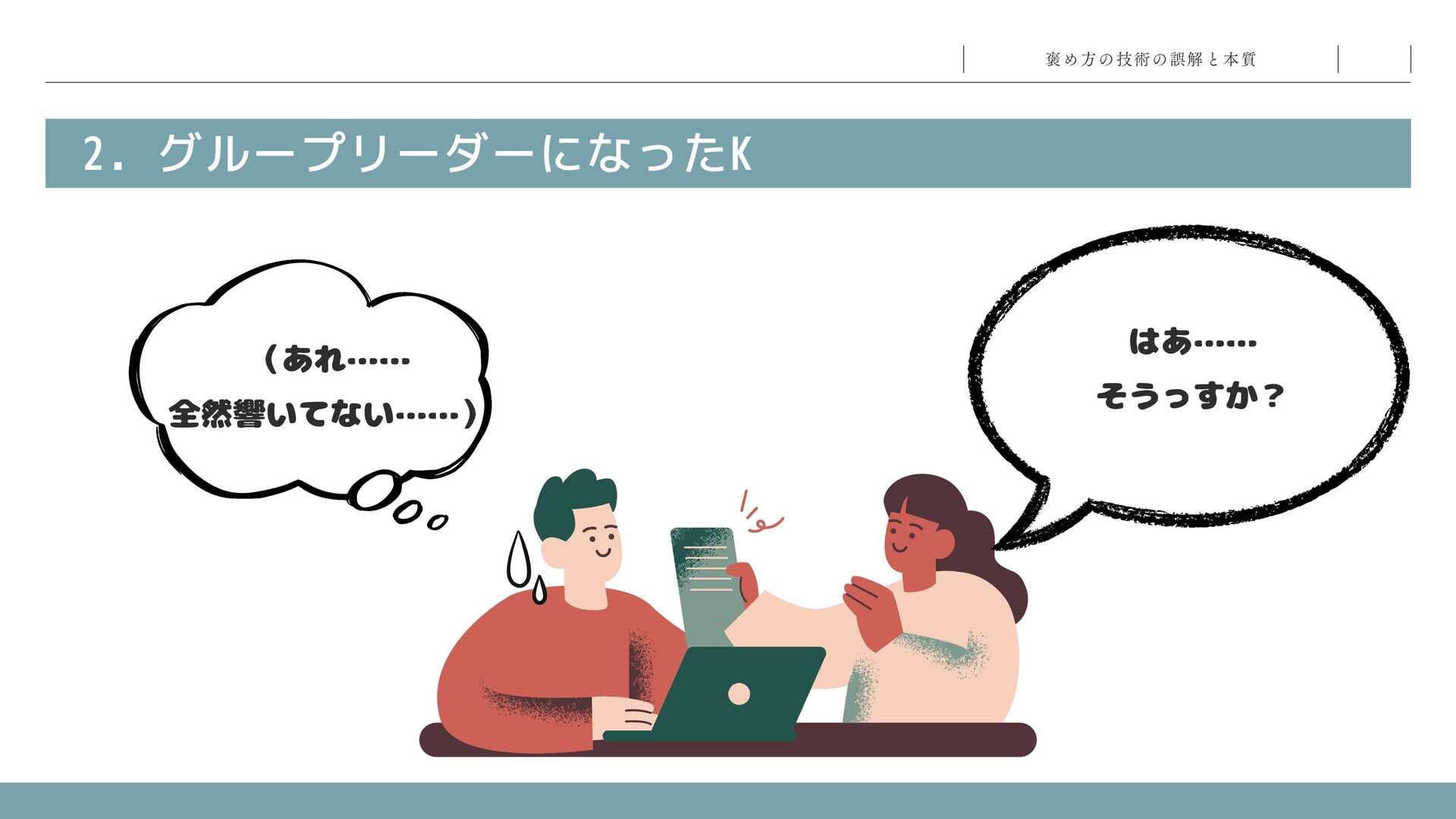 褒め方の技術の誤解と本質 2. グループリーダーになったK はあ…… そうっすか? (あれ…… 全然響いてない……)