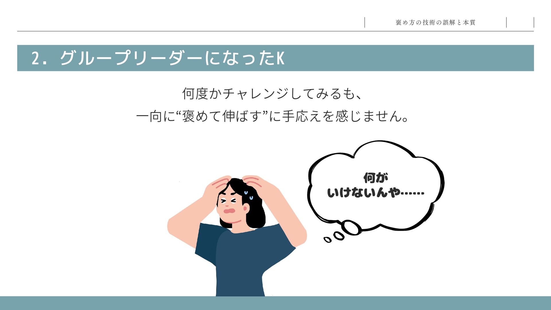 褒め方の技術の誤解と本質 2. グループリーダーになったK 何度かチャレンジしてみるも、 一向に“褒めて伸ばす”に手応えを感じません。 何が いけないんや……