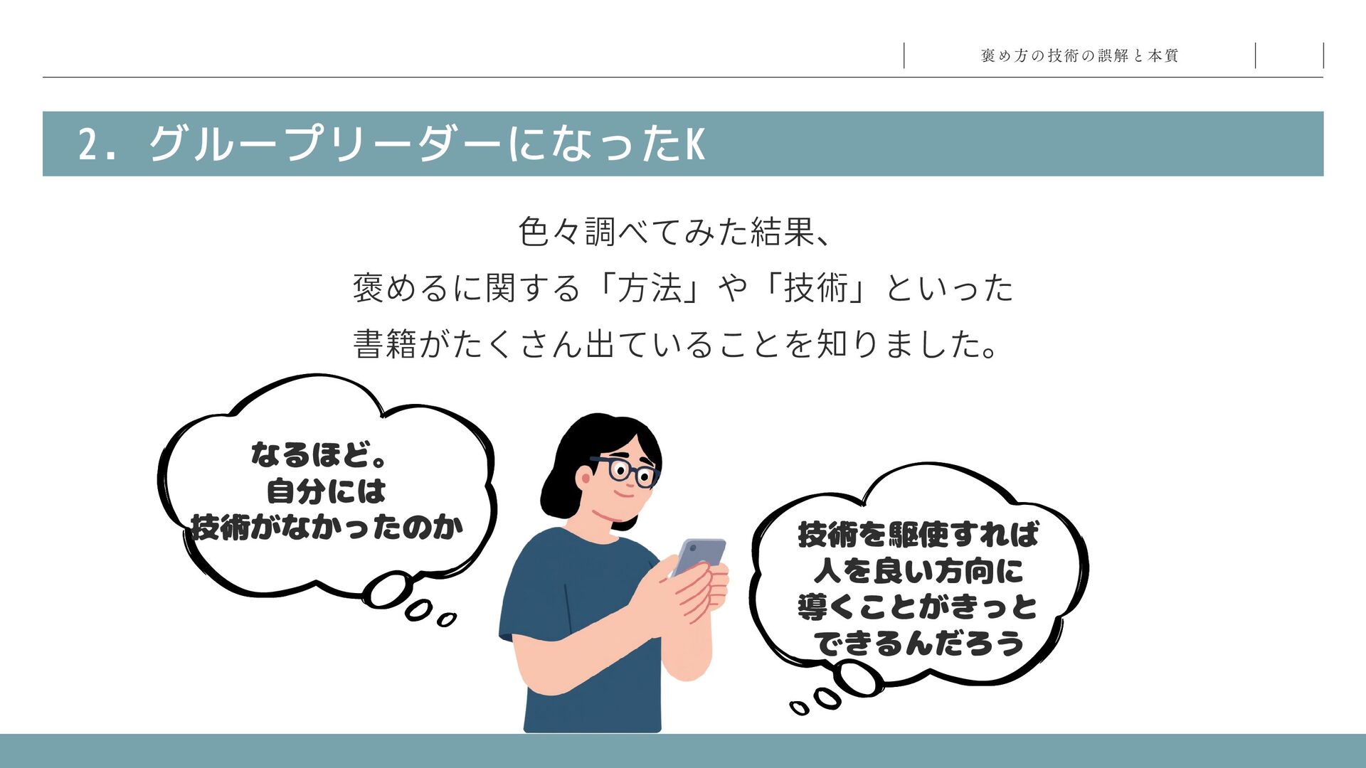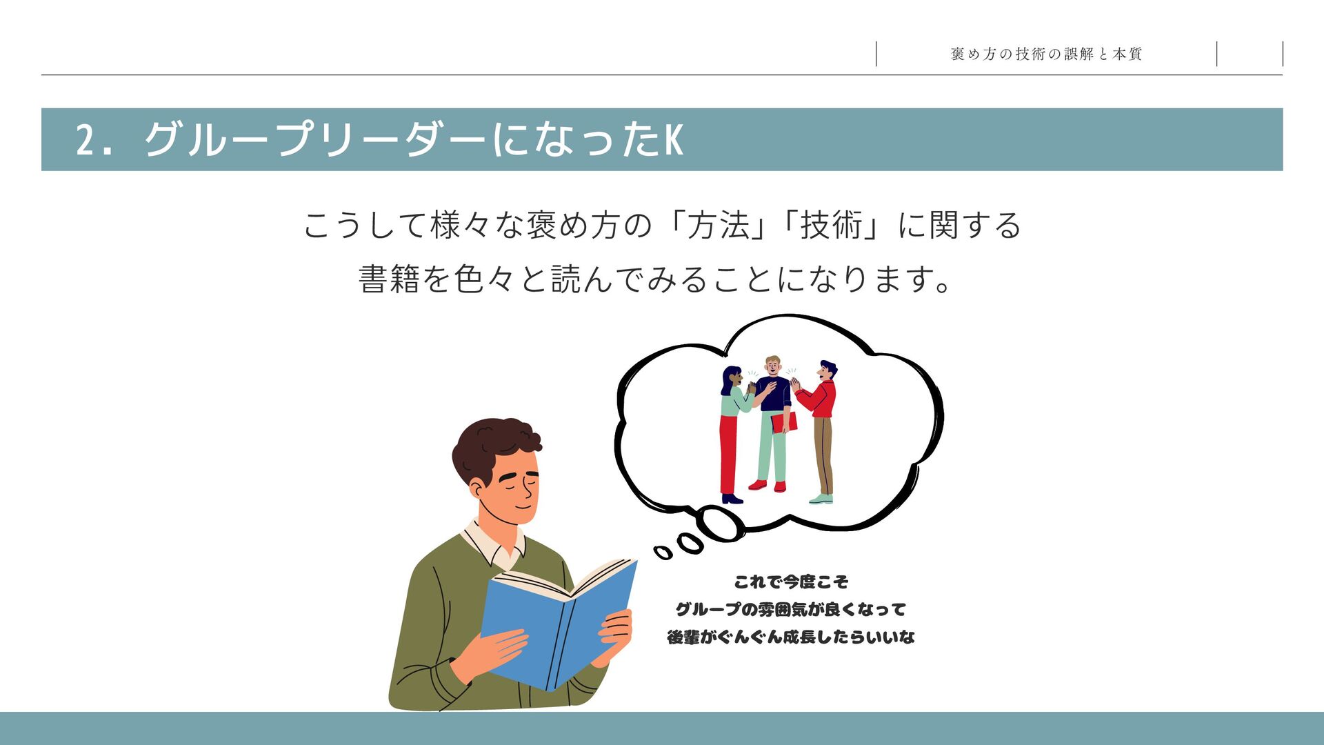 褒め方の技術の誤解と本質 色々調べてみた結果、 褒めるに関する「方法」や「技術」といった 書籍がたくさん出ていることを知りました。 2. グループリーダーになったK 技術を駆使すれば 人を良い方向に 導くことがきっと できるんだろう