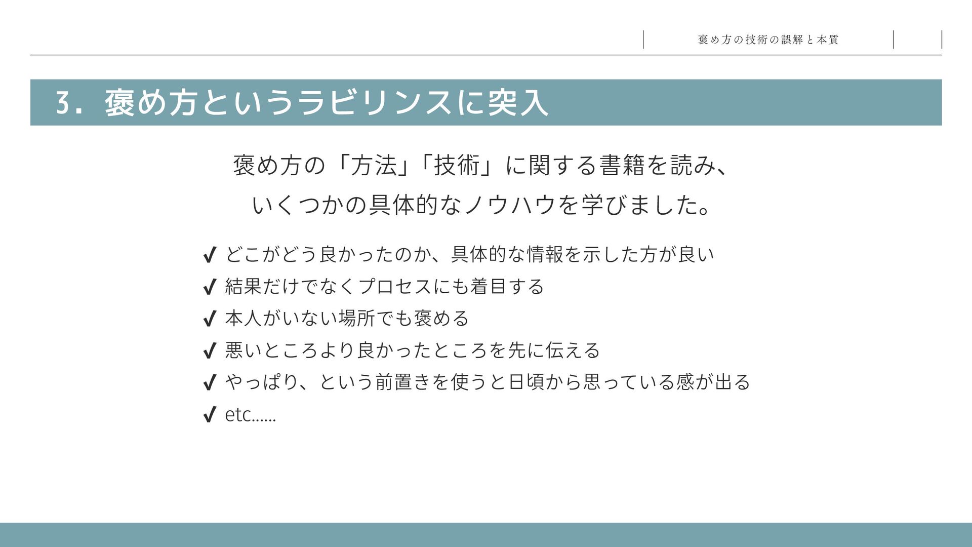 褒め方の技術の誤解と本質 褒め方の「方法」 「技術」に関する書籍を読み、 いくつかの具体的なノウハウを学びました。 3. 褒め方というラビリンスに突入 ✔ どこがどう良かったのか、具体的な情報を示した方が良い ✔ 結果だけでなくプロセスにも着目する