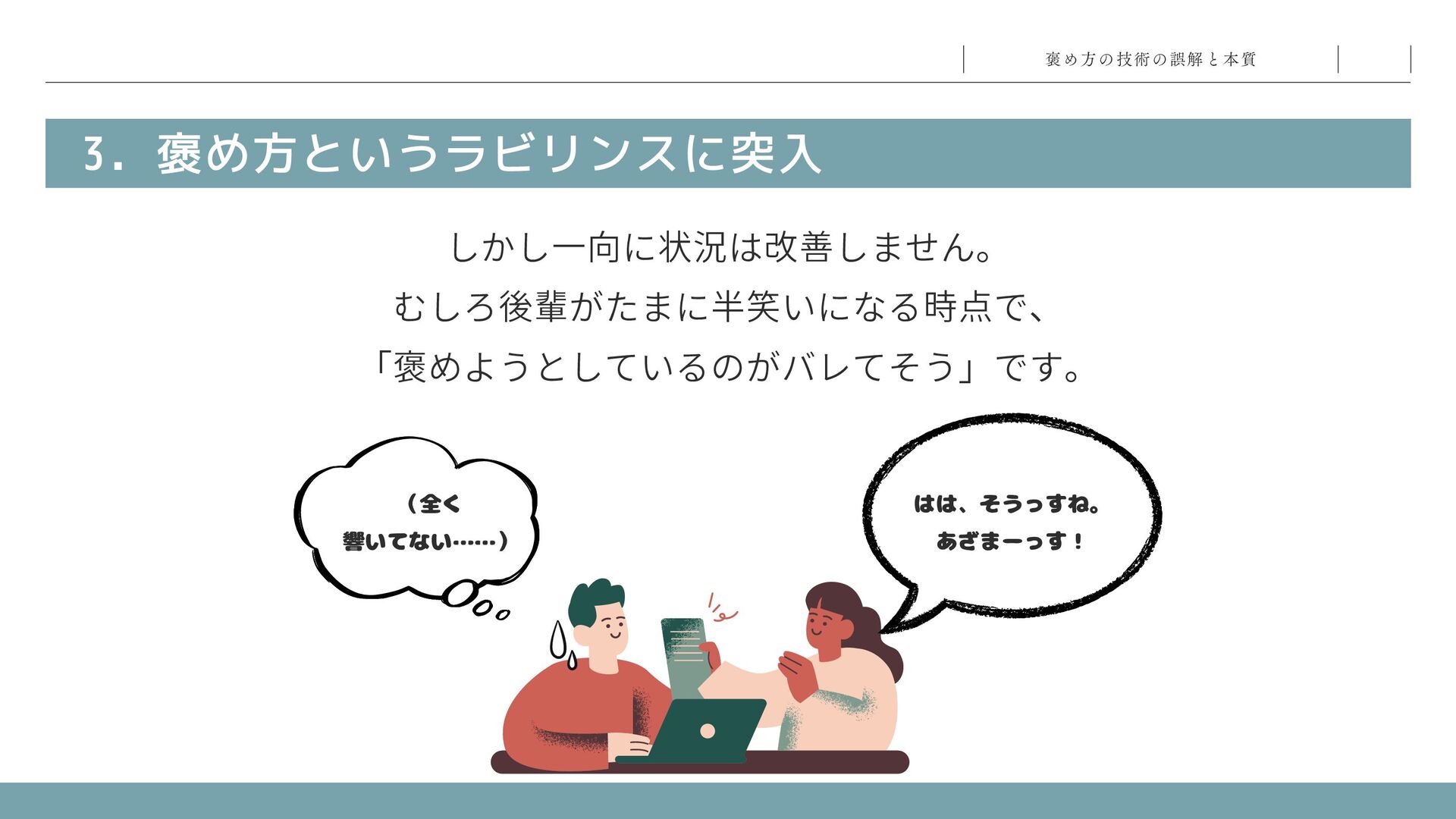 褒め方の技術の誤解と本質 しかし一向に状況は改善しません。 むしろ後輩がたまに半笑いになる時点で、 「褒めようとしているのがバレてそう」です。 3. 褒め方というラビリンスに突入 はは、そうっすね。 あざまーっす! (全く 響いてない……)