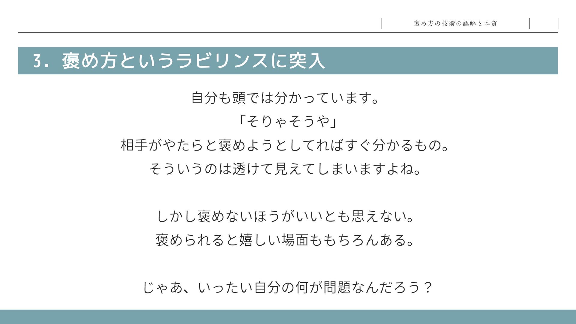 褒め方の技術の誤解と本質 自分も頭では分かっています。 「そりゃそうや」 相手がやたらと褒めようとしてればすぐ分かるもの。 そういうのは透けて見えてしまいますよね。 しかし褒めないほうがいいとも思えない。 褒められると嬉しい場面ももちろんある。 じゃあ、いったい自分の何が問題なんだろう? 3. 褒め方というラビリンスに突入