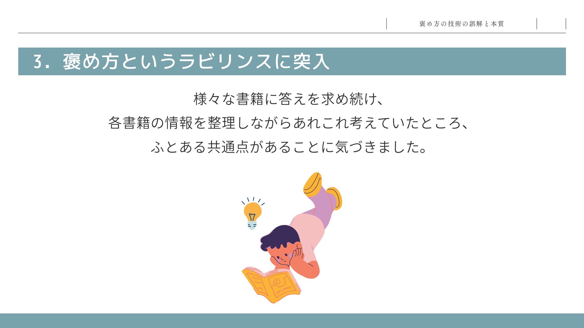 褒め方の技術の誤解と本質 様々な書籍に答えを求め続け、 各書籍の情報を整理しながらあれこれ考えていたところ、 ふとある共通点があることに気づきました。 3. 褒め方というラビリンスに突入