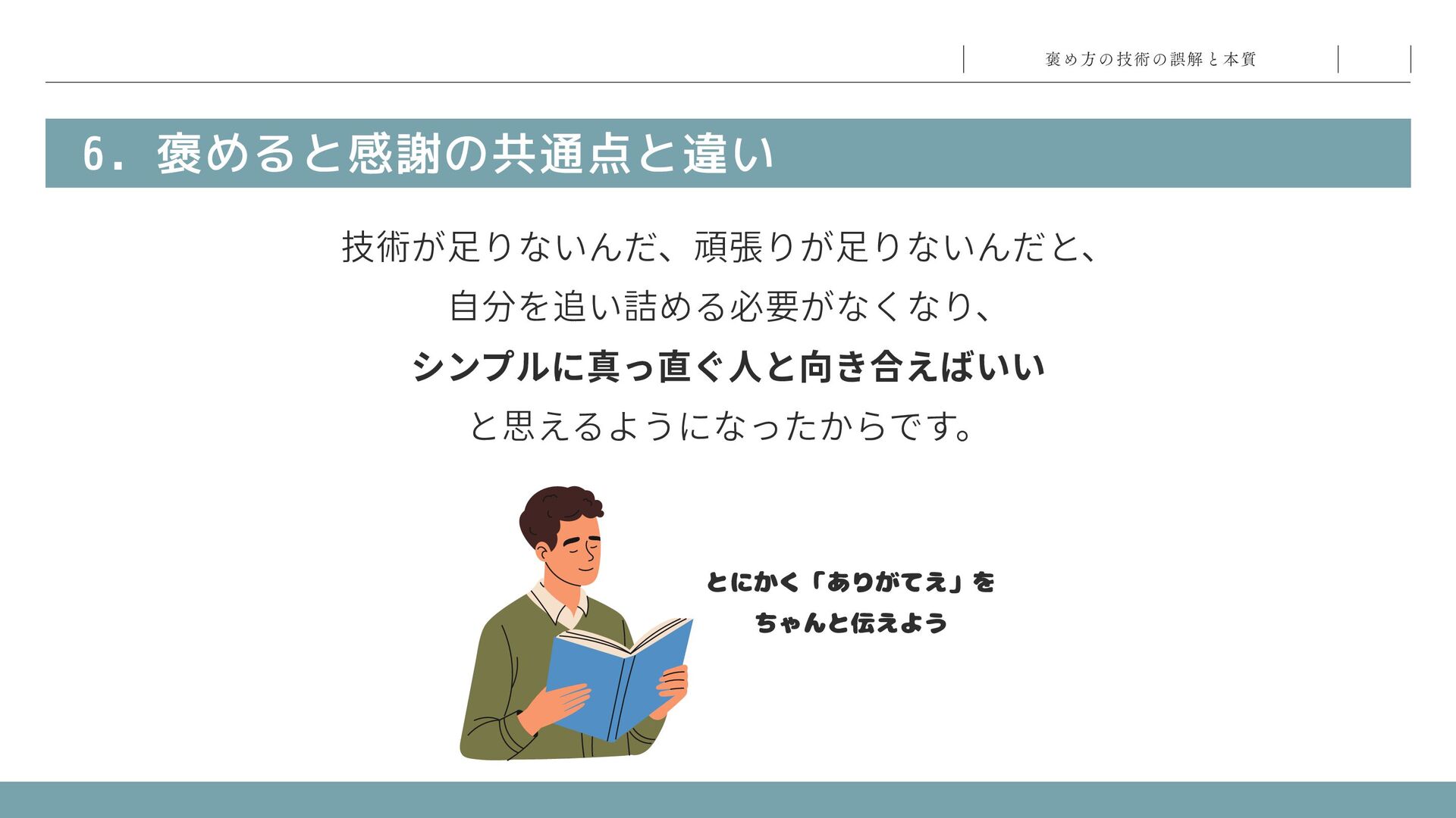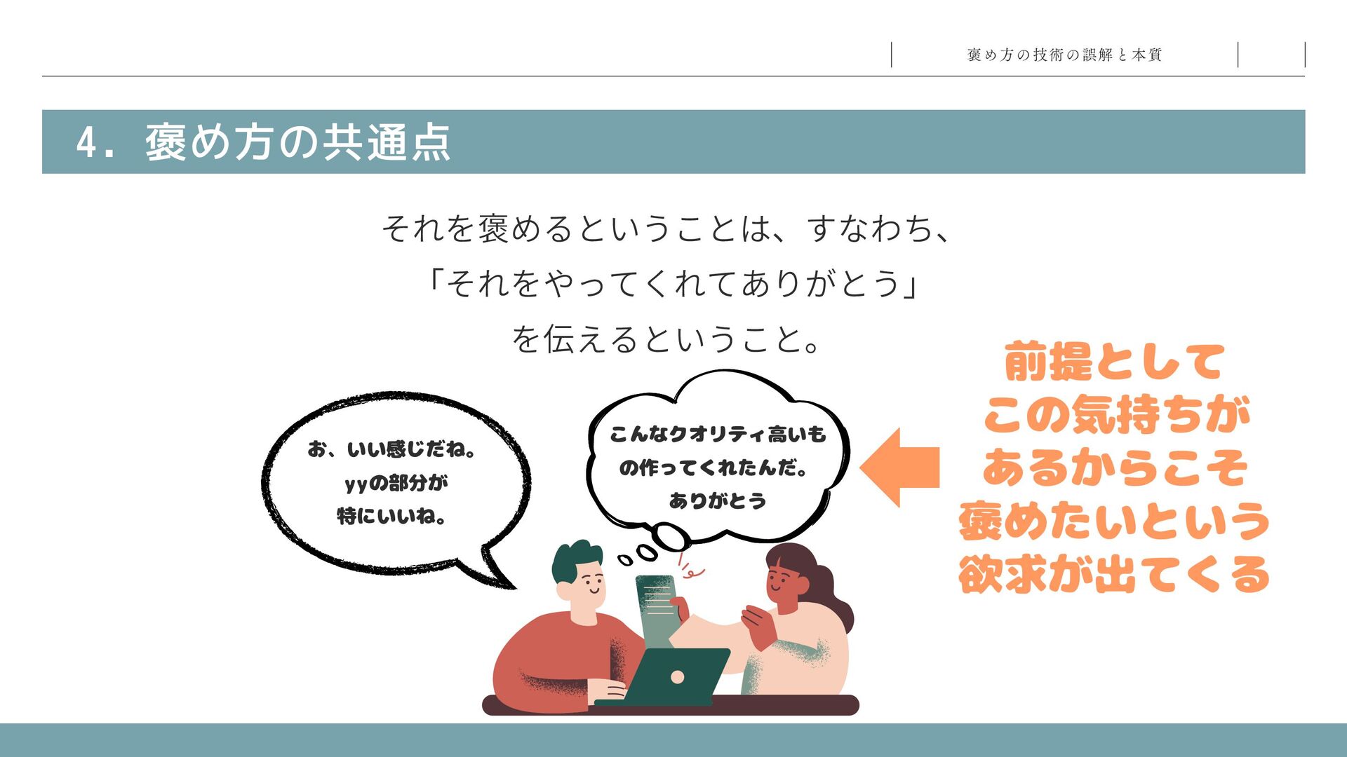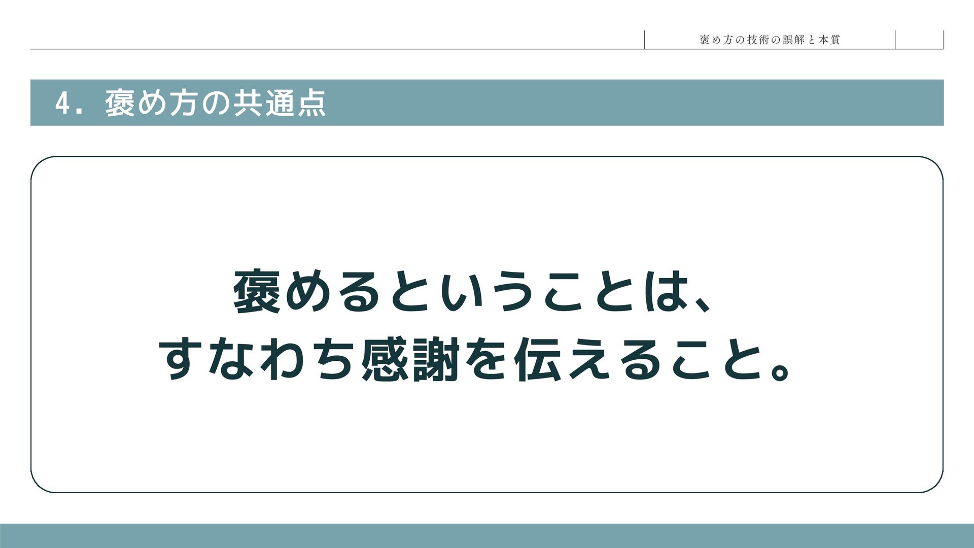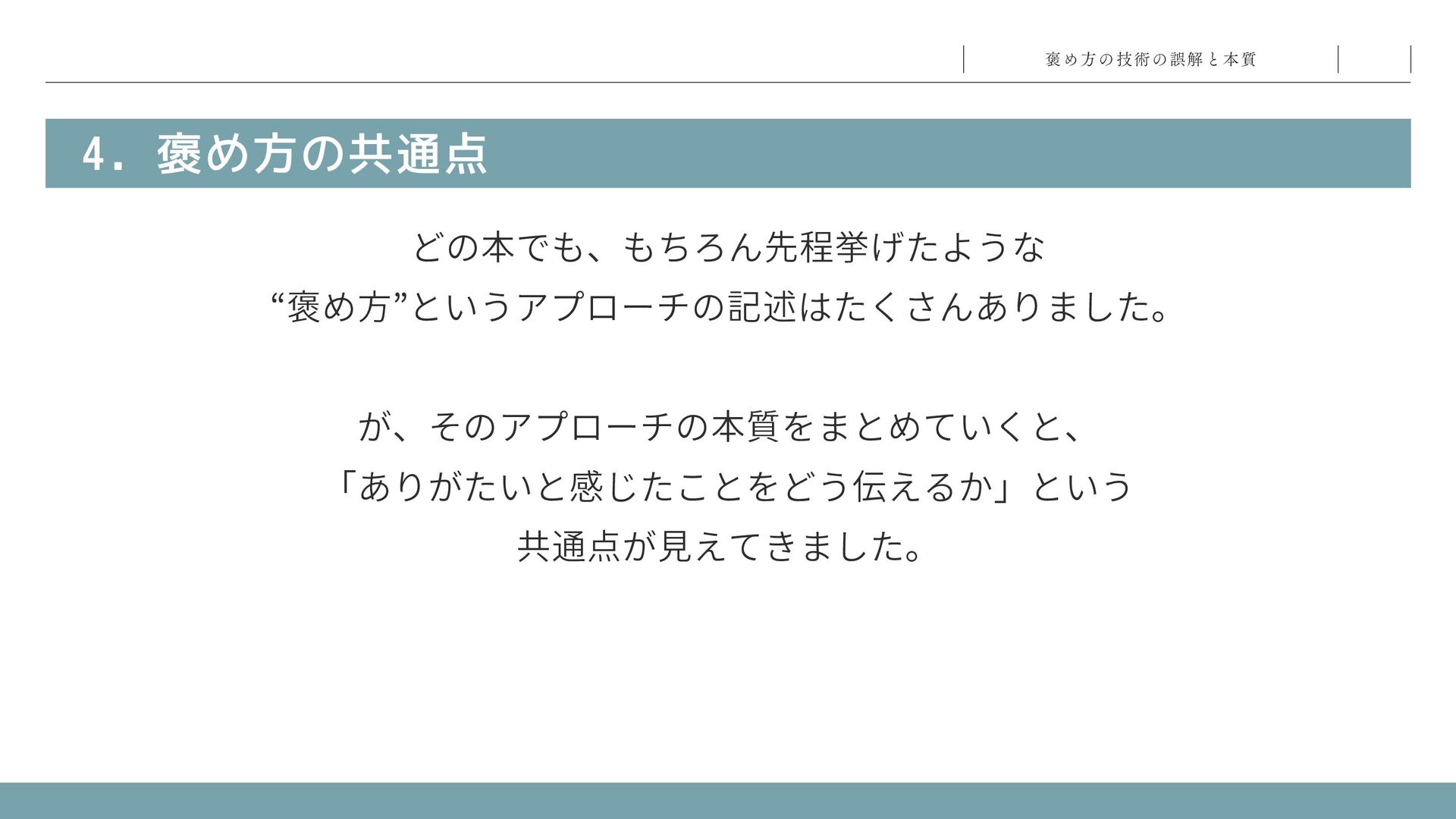 褒め方の技術の誤解と本質 どの本でも、もちろん先程挙げたような “褒め方”というアプローチの記述はたくさんありました。 が、そのアプローチの本質をまとめていくと、 「ありがたいと感じたことをどう伝えるか」という 共通点が見えてきました。 4. 褒め方の共通点