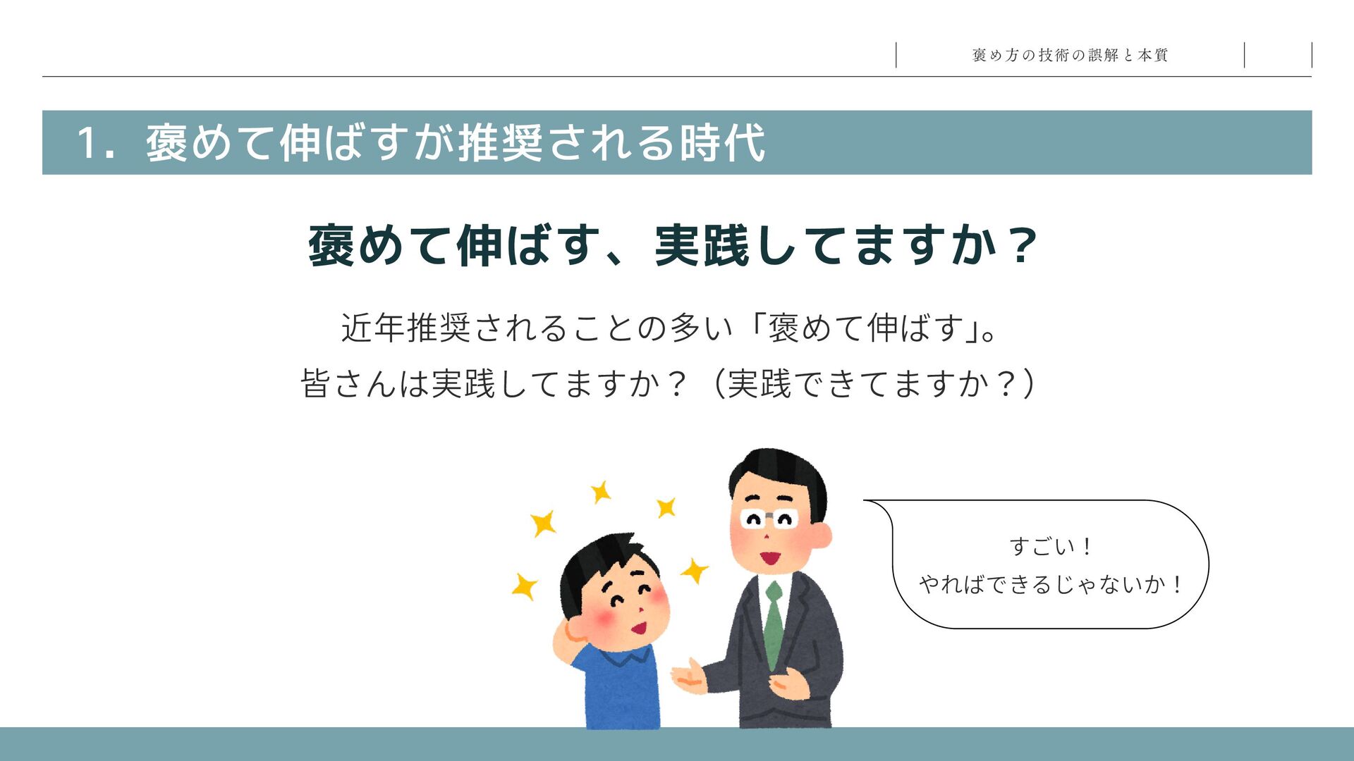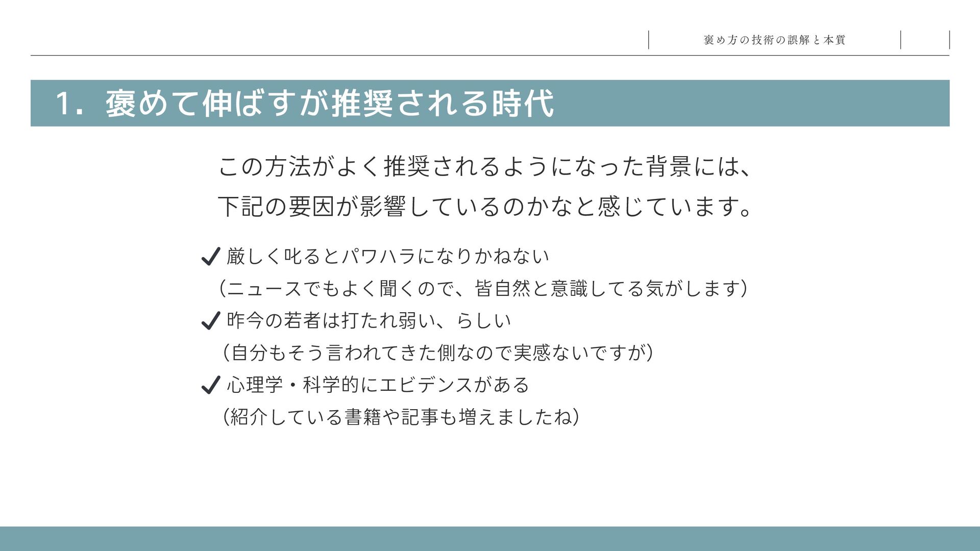 褒め方の技術の誤解と本質 1. 褒めて伸ばすが推奨される時代 この方法がよく推奨されるようになった背景には、 下記の要因が影響しているのかなと感じています。 ✔ 厳しく叱るとパワハラになりかねない (ニュースでもよく聞くので、皆自然と意識してる気がします) ✔ 昨今の若者は打たれ弱い、らしい