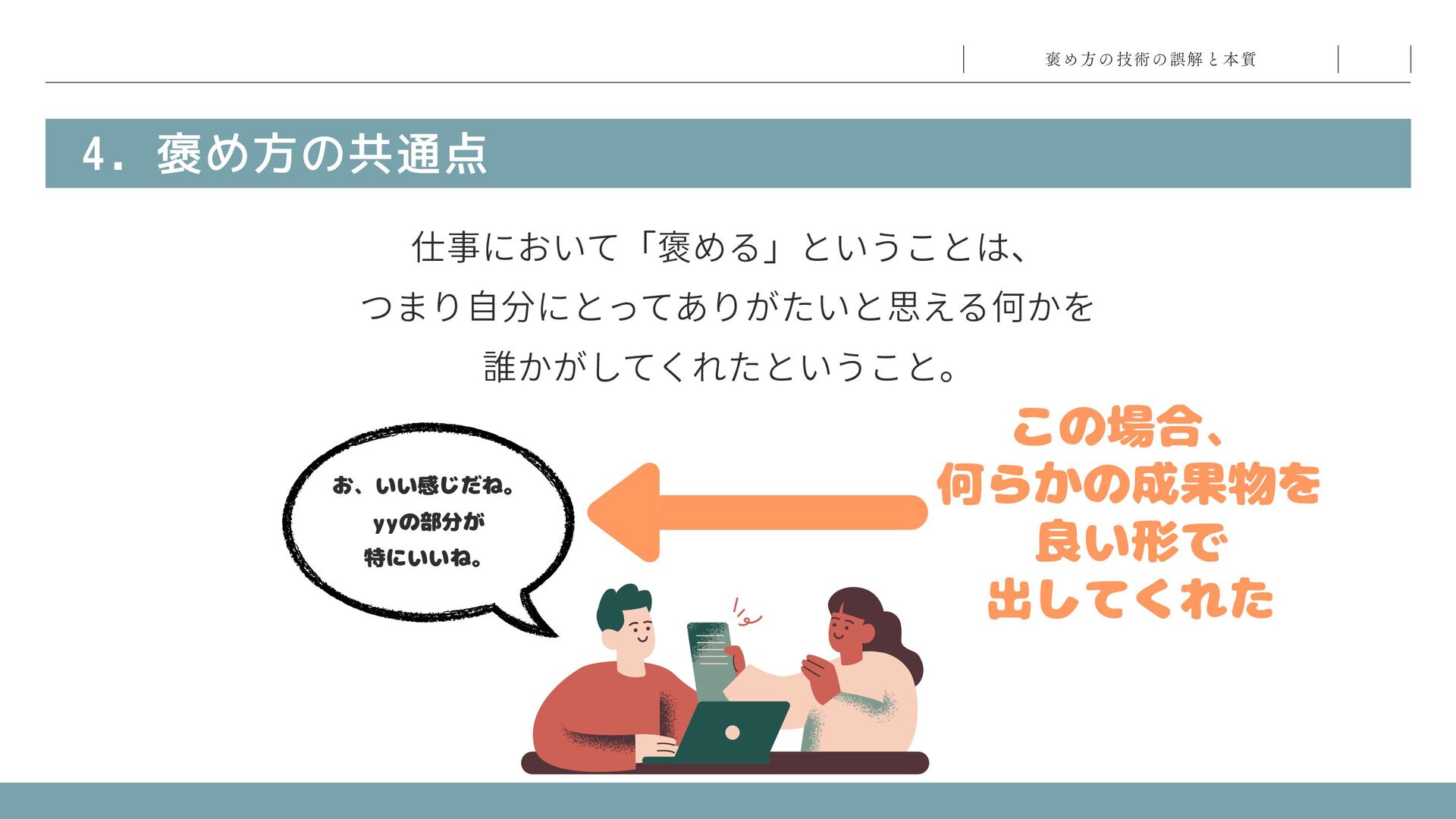 褒め方の技術の誤解と本質 仕事において「褒める」ということは、 つまり自分にとってありがたいと思える何かを 誰かがしてくれたということ。 4. 褒め方の共通点 お、いい感じだね。 yyの部分が 特にいいね。 この場合、