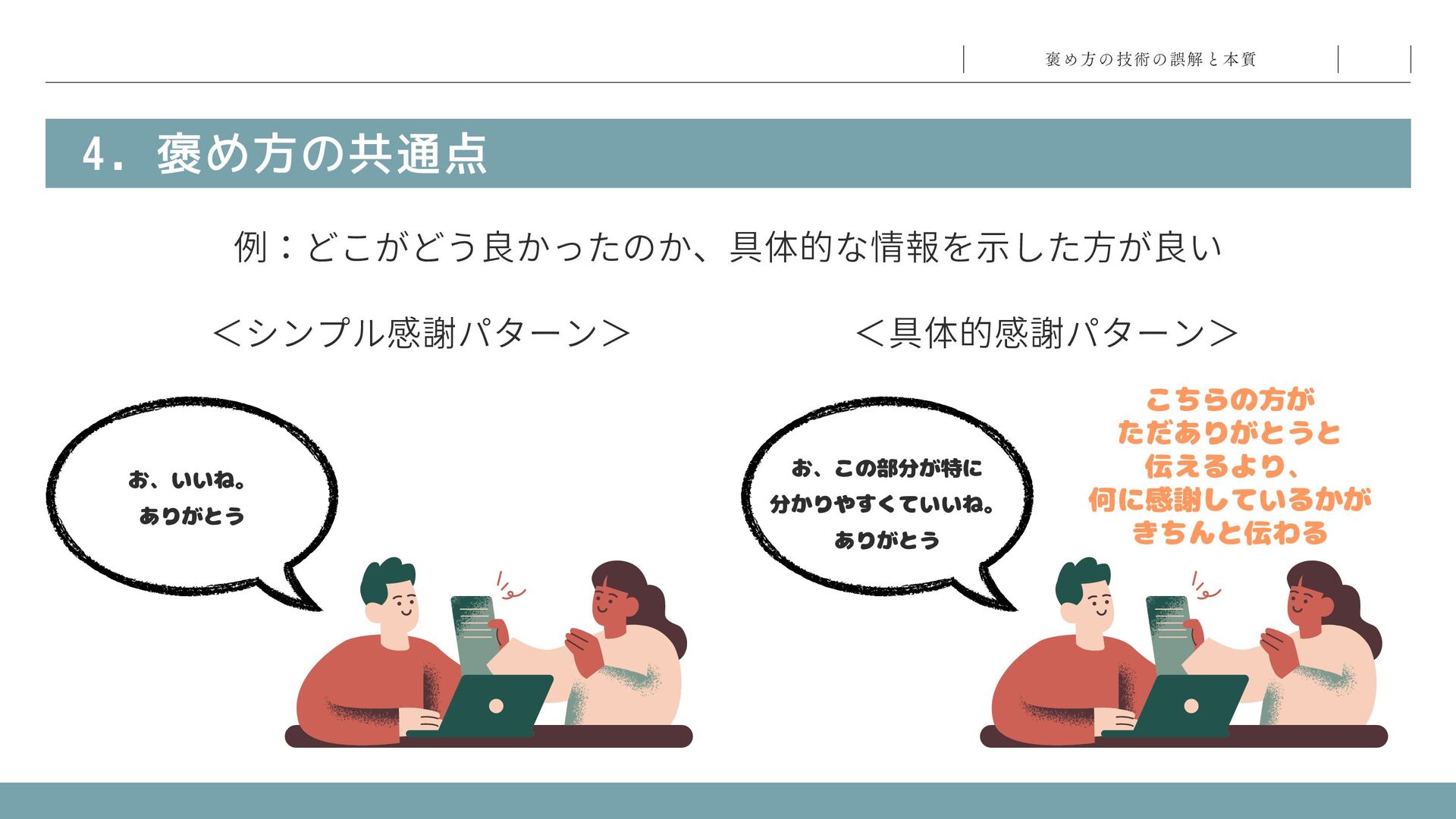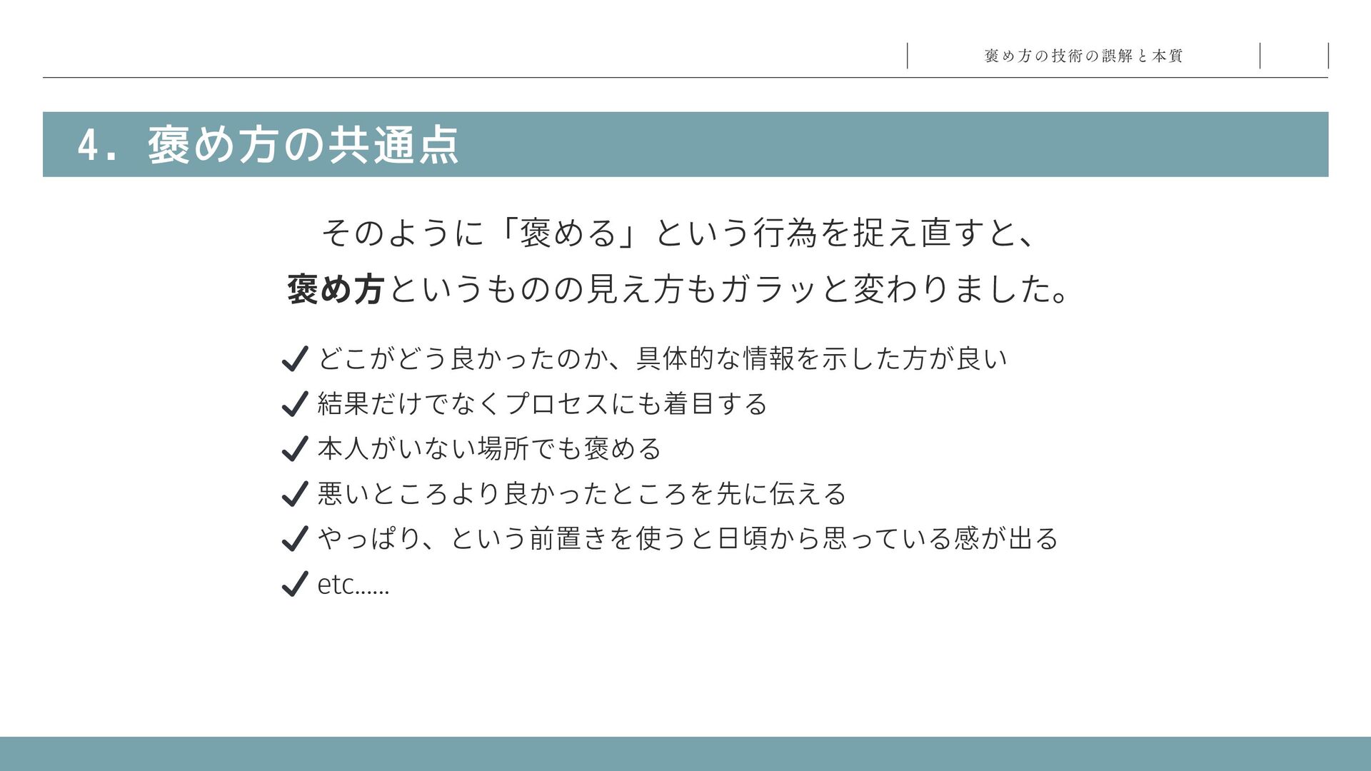 褒め方の技術の誤解と本質 そのように「褒める」という行為を捉え直すと、 褒め方というものの見え方もガラッと変わりました。 4. 褒め方の共通点 ✔ どこがどう良かったのか、具体的な情報を示した方が良い ✔ 結果だけでなくプロセスにも着目する ✔