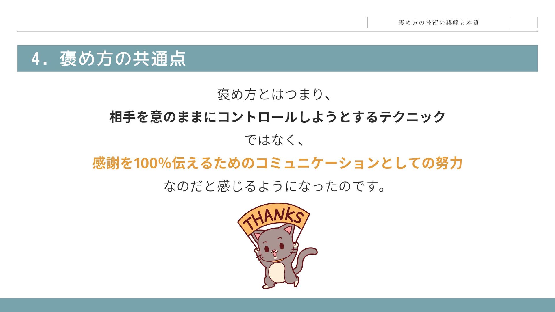4. 褒め方の共通点 褒め方の技術の誤解と本質 褒めるということは、 すなわち感謝を伝えること。