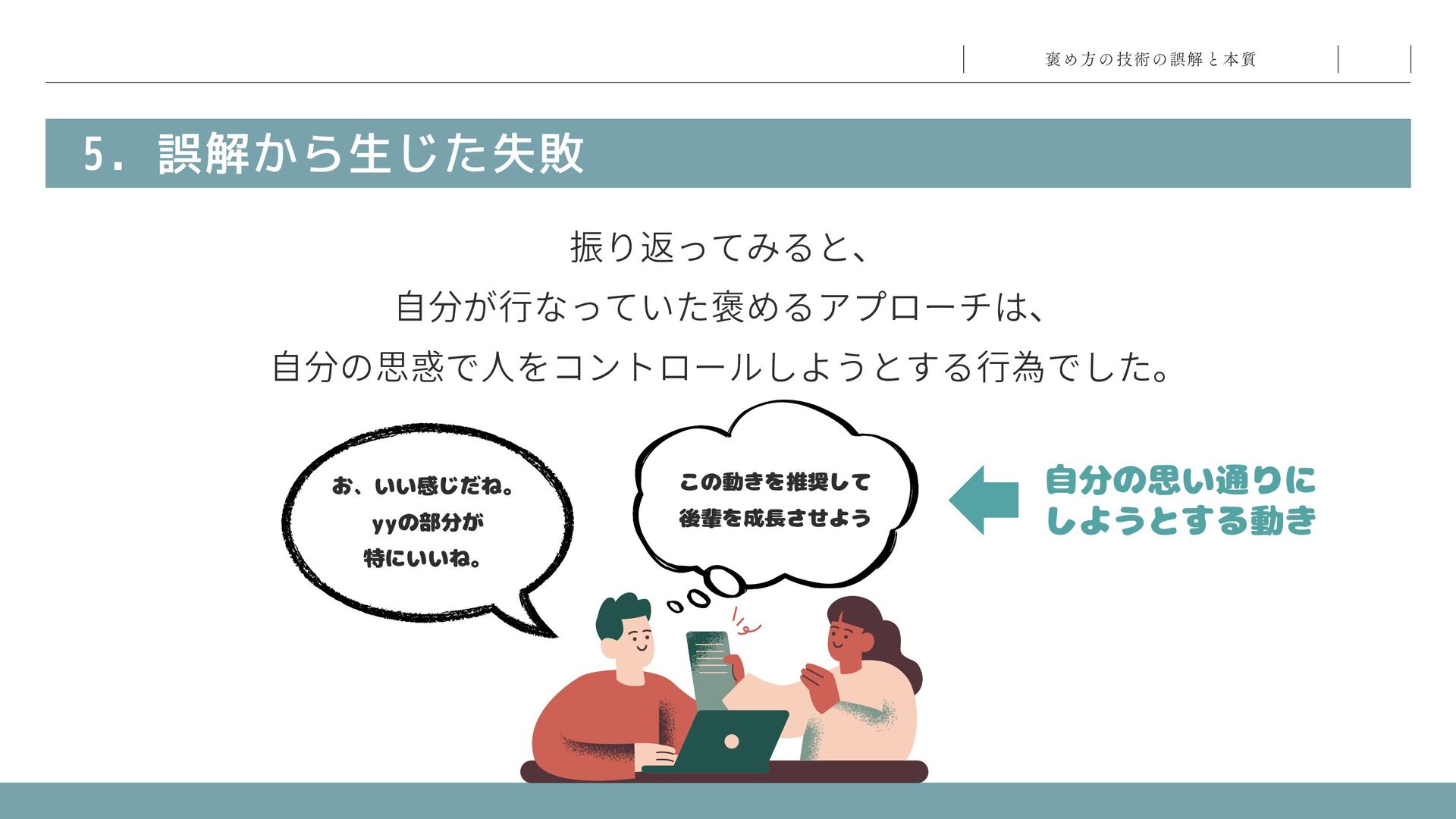 褒め方の技術の誤解と本質 振り返ってみると、 自分が行なっていた褒めるアプローチは、 自分の思惑で人をコントロールしようとする行為でした。 5. 誤解から生じた失敗 お、いい感じだね。 yyの部分が 特にいいね。 この動きを推奨して