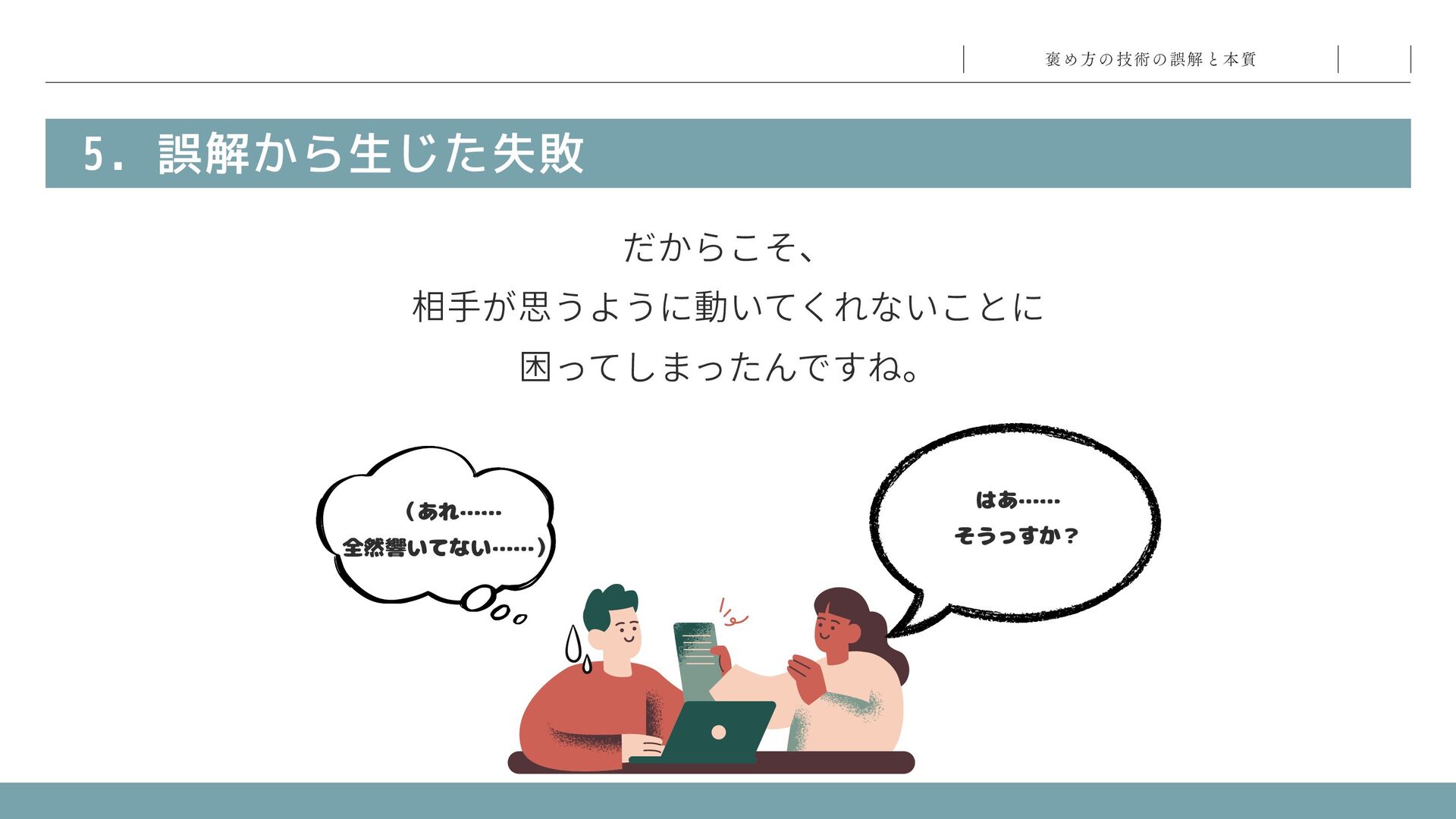 褒め方の技術の誤解と本質 だからこそ、 相手が思うように動いてくれないことに 困ってしまったんですね。 5. 誤解から生じた失敗 はあ…… そうっすか? (あれ…… 全然響いてない……)