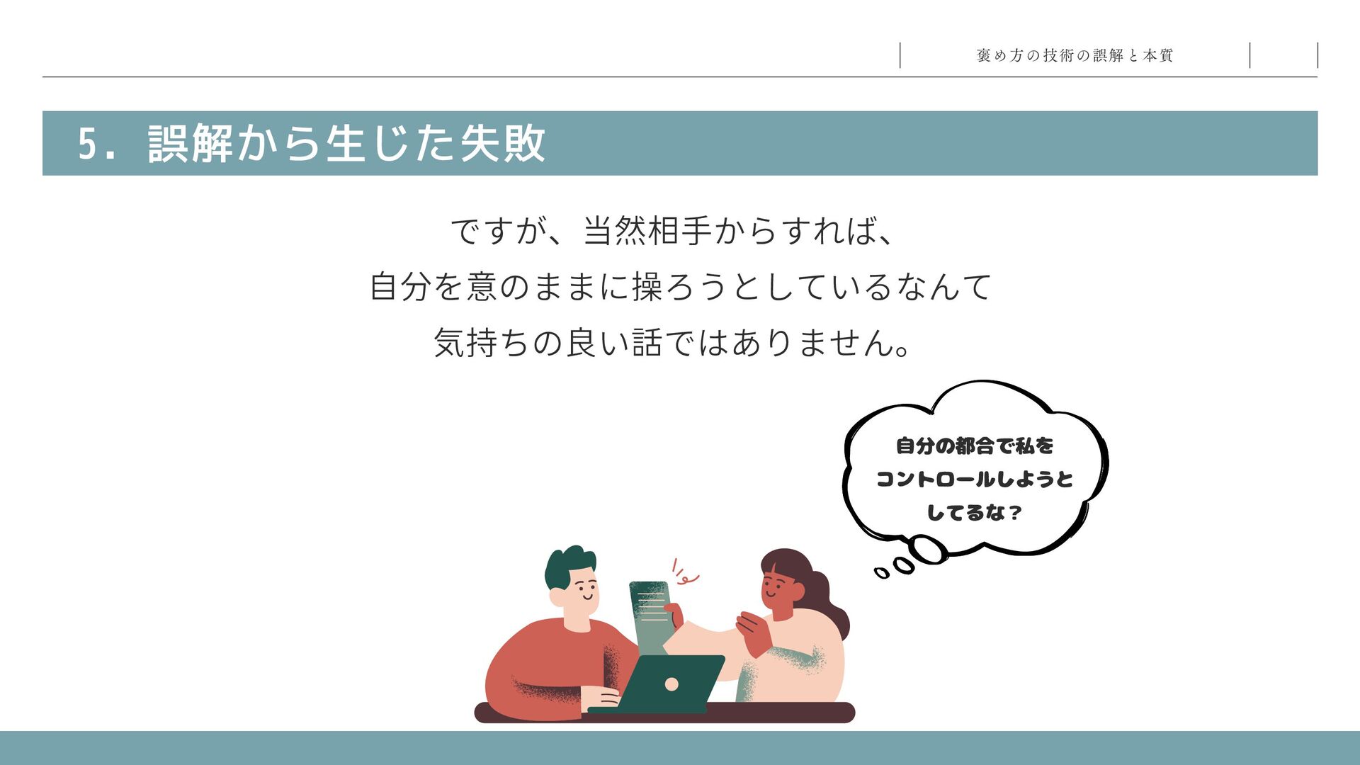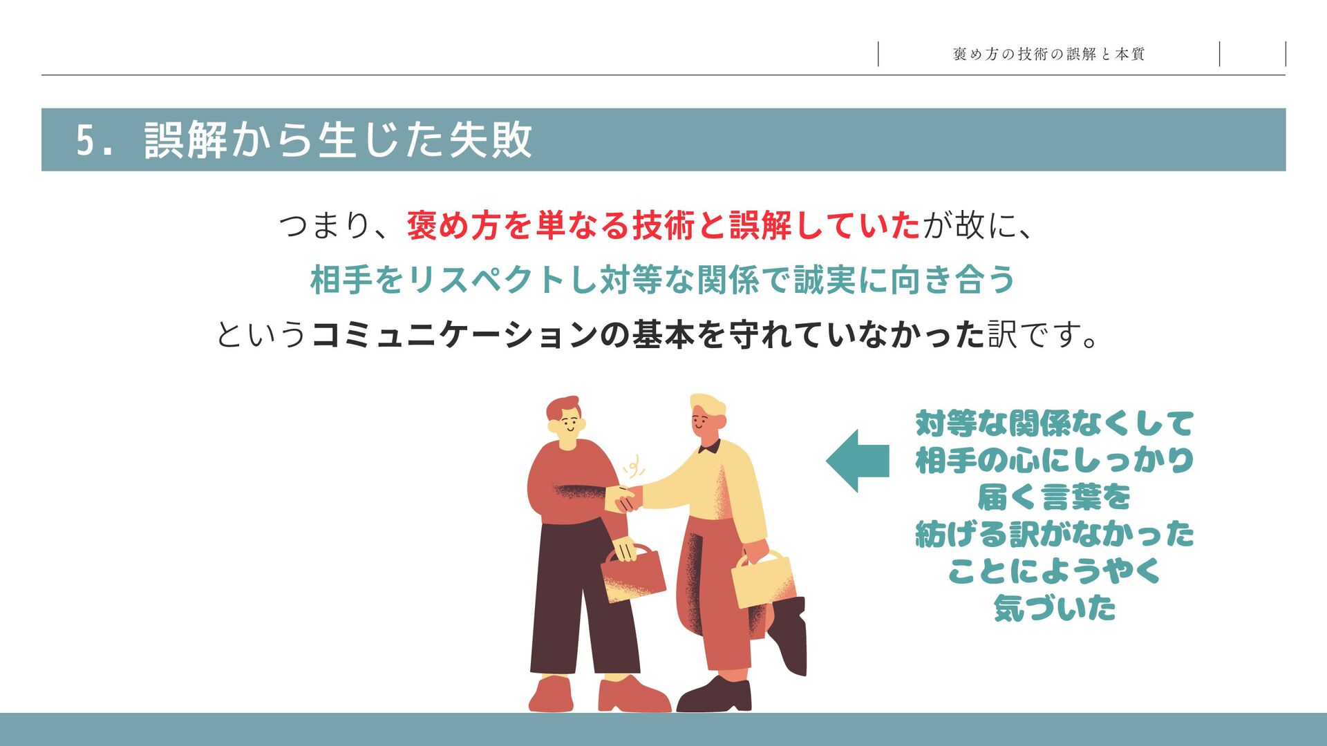 褒め方の技術の誤解と本質 5. 誤解から生じた失敗 つまり、褒め方を単なる技術と誤解していたが故に、 相手をリスペクトし対等な関係で誠実に向き合う というコミュニケーションの基本を守れていなかった訳です。 対等な関係なくして 相手の心にしっかり 届く言葉を 紡げる訳がなかった