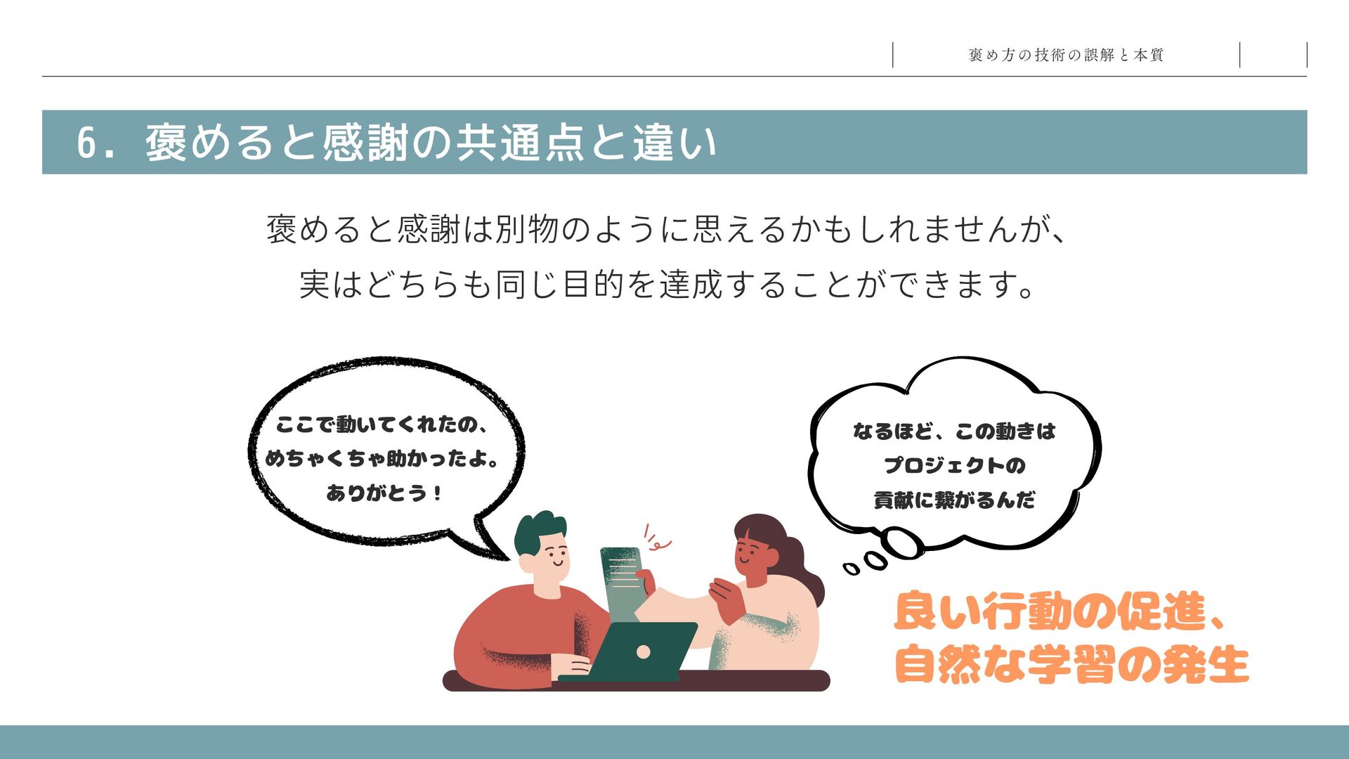 褒め方の技術の誤解と本質 褒めると感謝は別物のように思えるかもしれませんが、 実はどちらも同じ目的を達成することができます。 6. 褒めると感謝の共通点と違い なるほど、この動きは プロジェクトの 貢献に繋がるんだ ここで動いてくれたの、 めちゃくちゃ助かったよ。