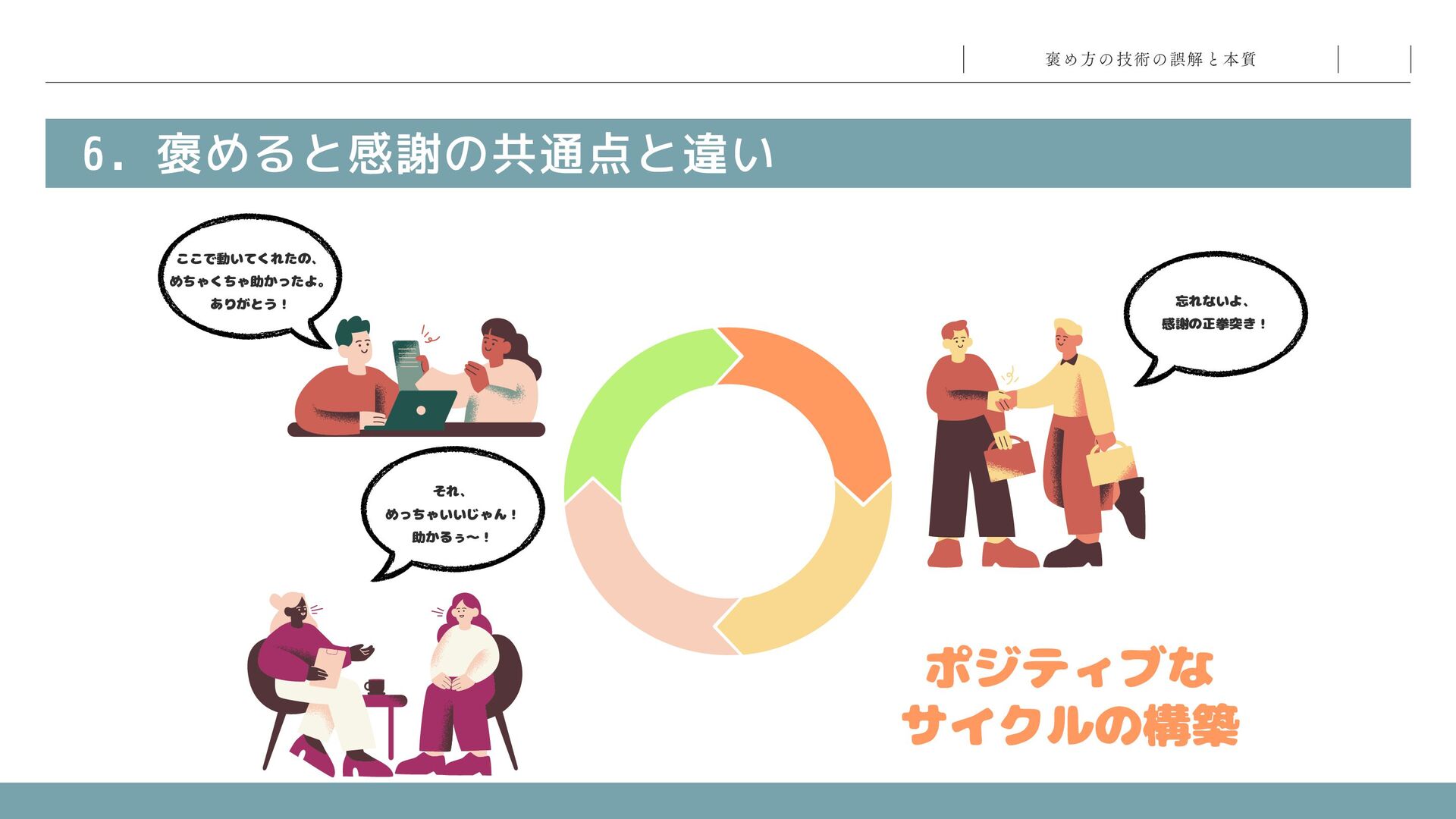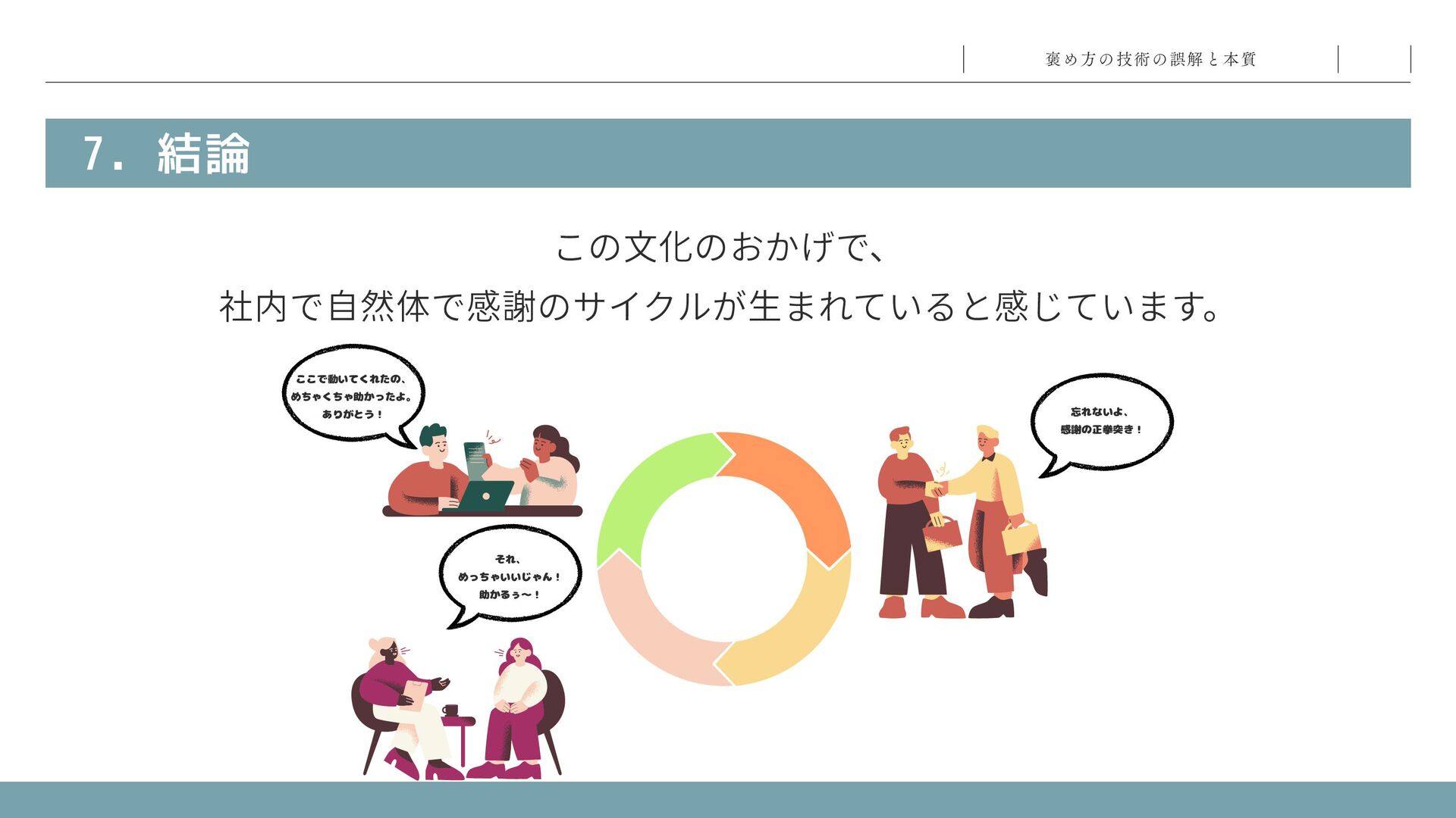 褒め方の技術の誤解と本質 この文化のおかげで、 社内で自然体で感謝のサイクルが生まれていると感じています。 7. 結論 ここで動いてくれたの、 めちゃくちゃ助かったよ。 ありがとう! それ、 めっちゃいいじゃん!