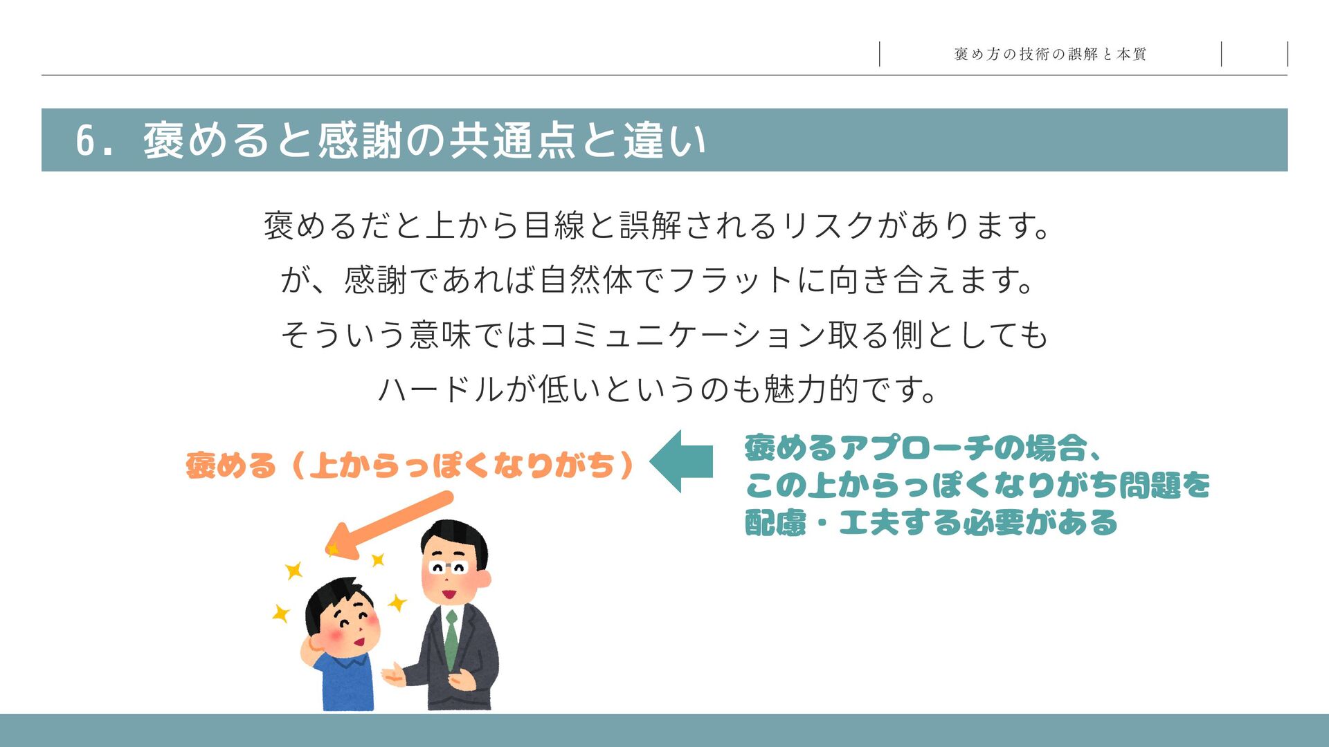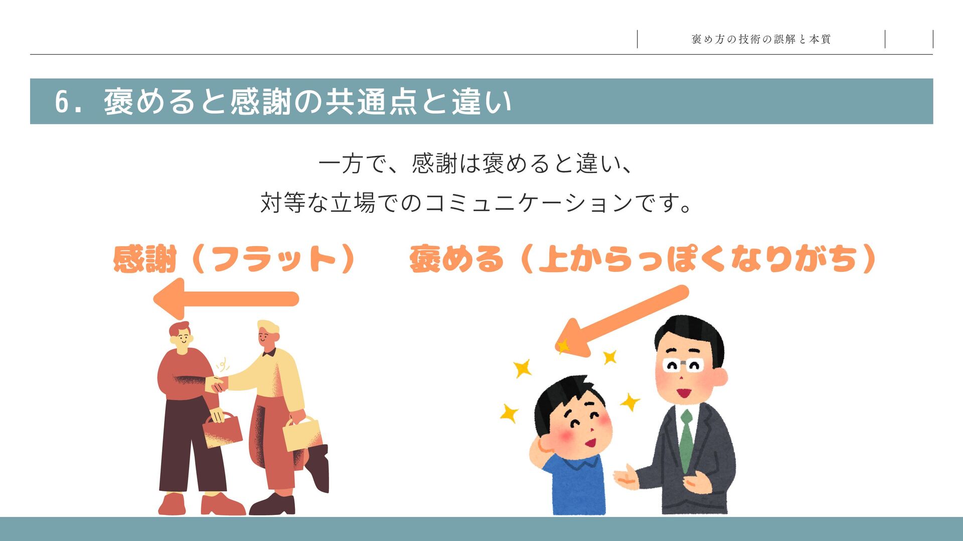 褒め方の技術の誤解と本質 褒めるだと上から目線と誤解されるリスクがあります。 が、感謝であれば自然体でフラットに向き合えます。 そういう意味ではコミュニケーション取る側としても ハードルが低いというのも魅力的です。 6. 褒めると感謝の共通点と違い 褒める(上からっぽくなりがち) 褒めるアプローチの場合、 この上からっぽくなりがち問題を